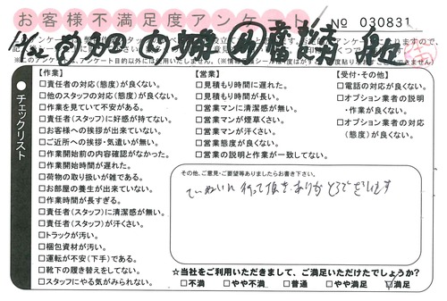 引越一番でお引越しをしていただいたお客様のうち、コメントいただいたアンケートを全て掲載しています。
