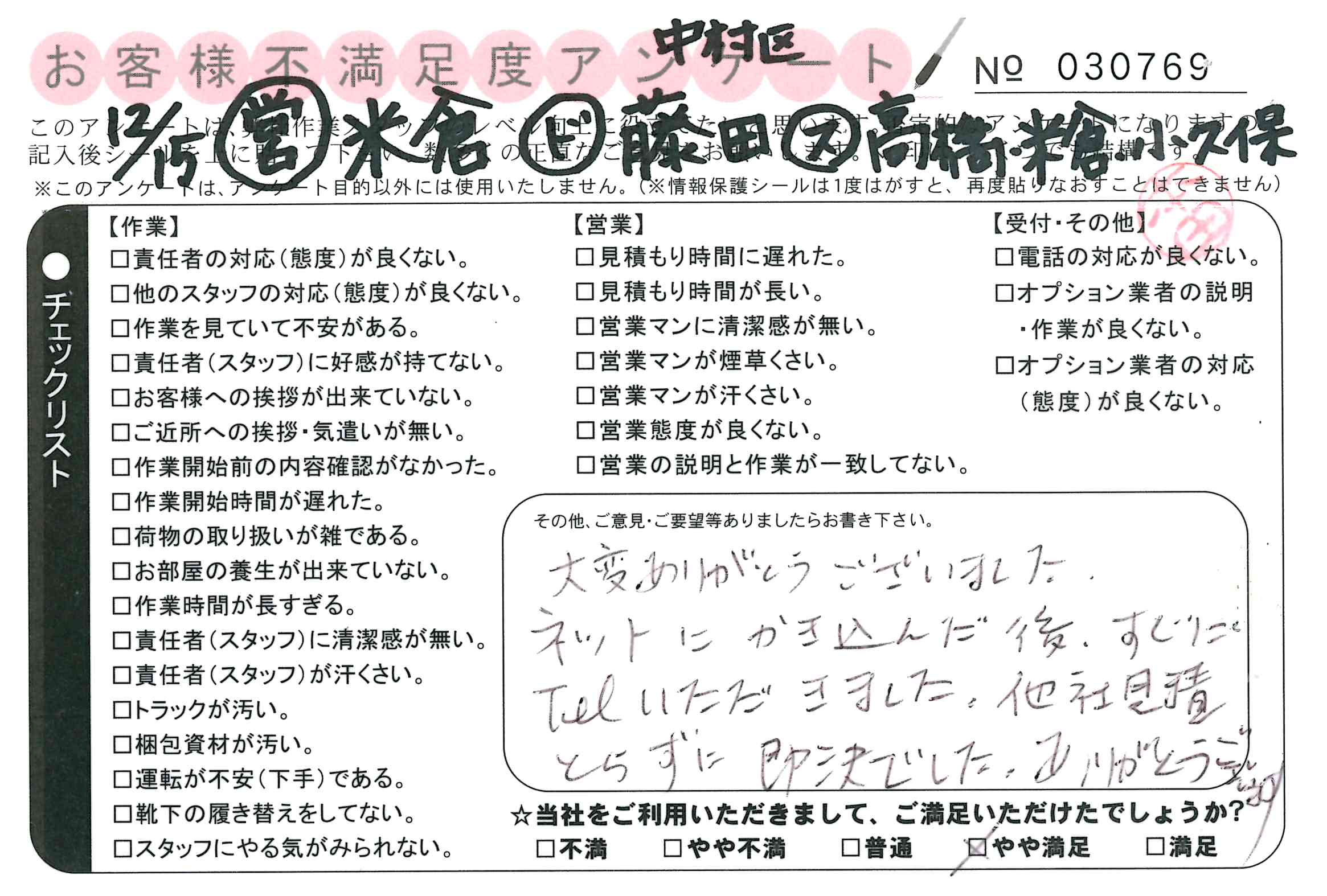 12/15 引越 営業:花村 ドライバー:米倉 スタッフ:森田・小久保* ムダのない動きでとてもスムーズでたすかりました。