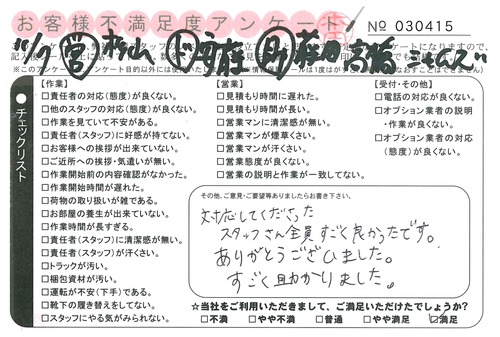 引越一番でお引越しをしていただいたお客様のうち、コメントいただいたアンケートを全て掲載しています。