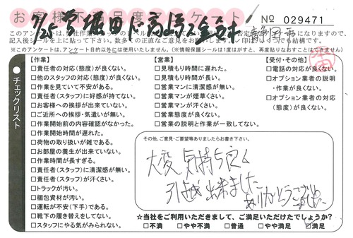 引越一番でお引越しをしていただいたお客様のうち、コメントいただいたアンケートを全て掲載しています。