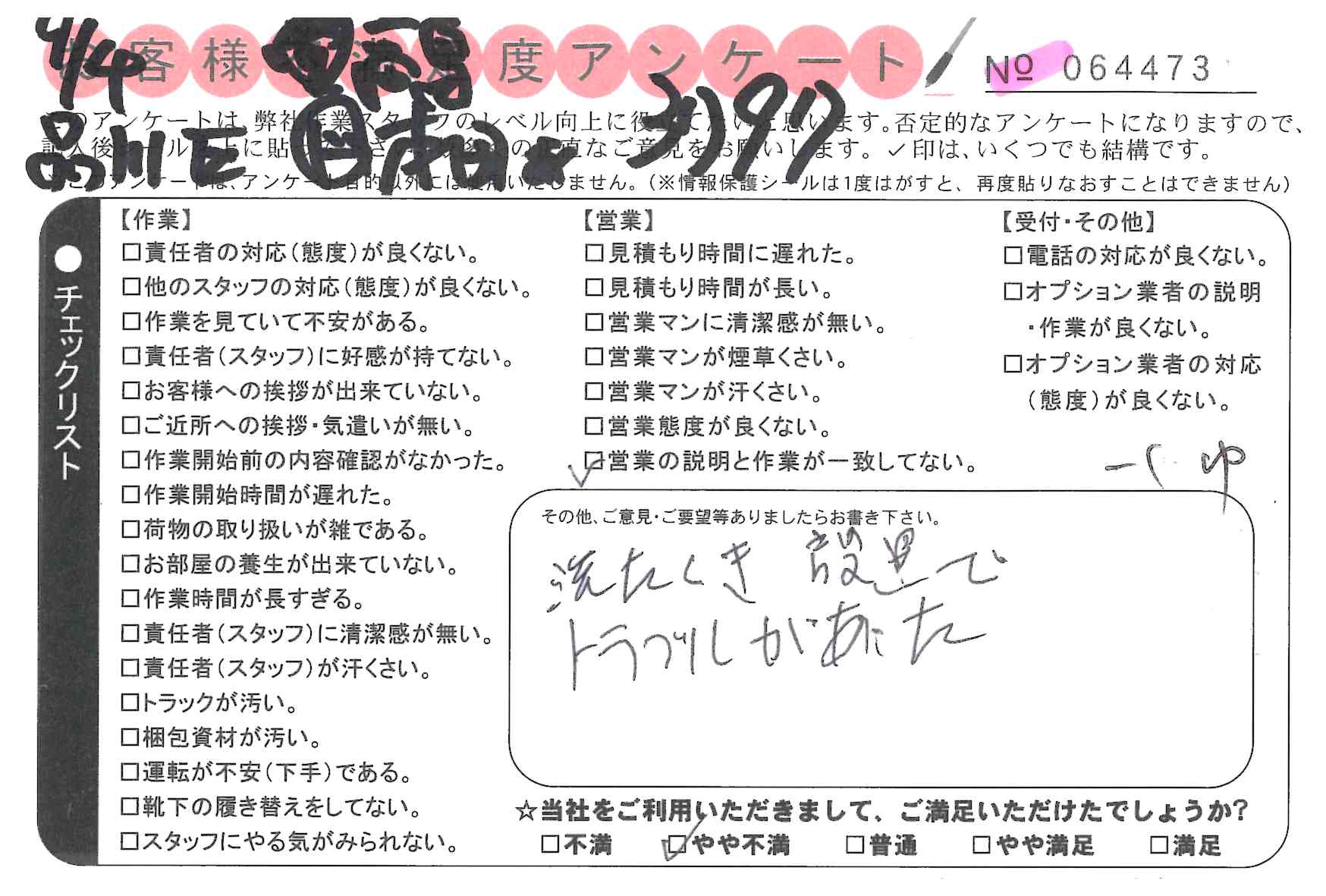 * 洗濯機設置でトラブルがあった。