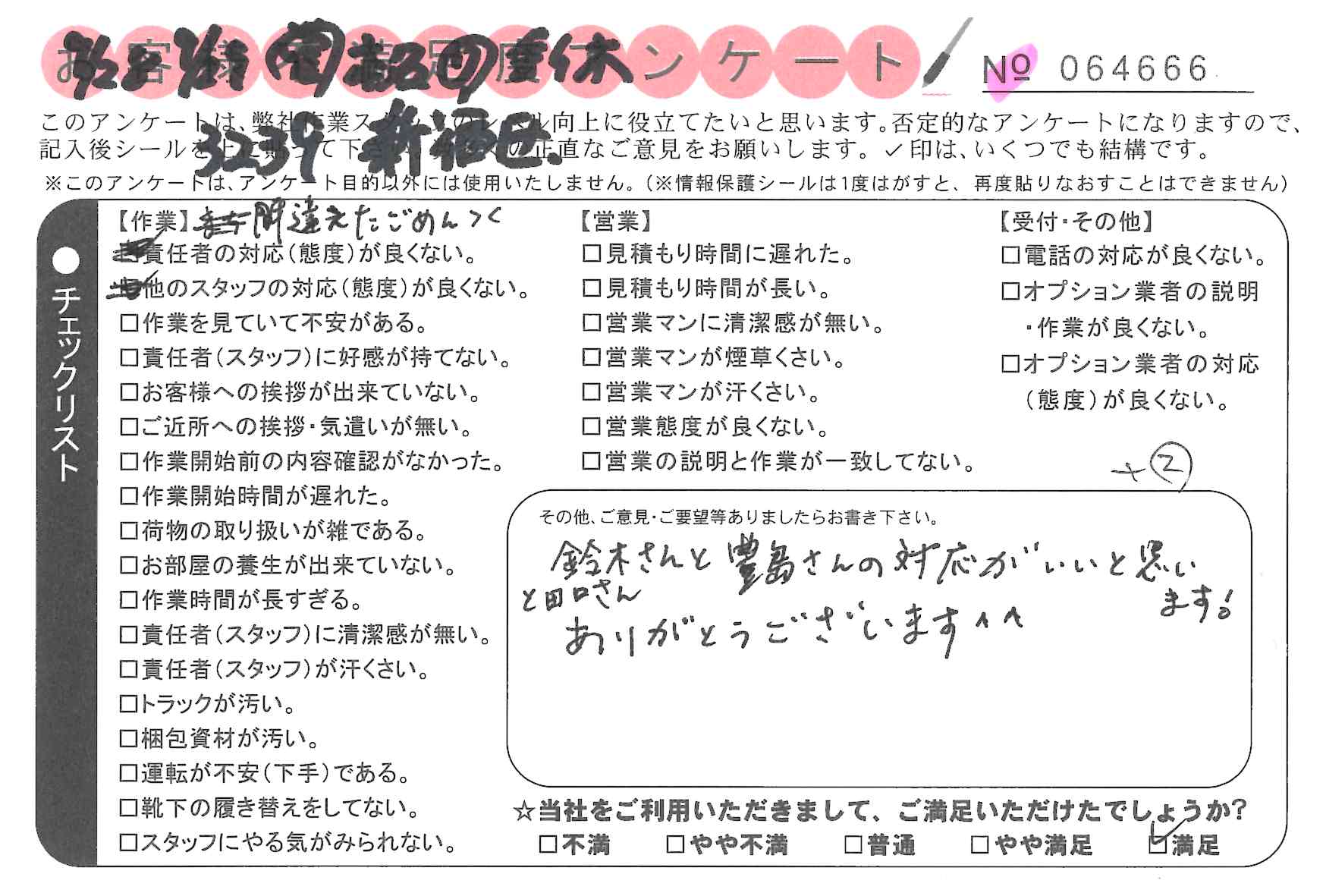 * 鈴木さんと豊島さんと田口さんの対応がいいと