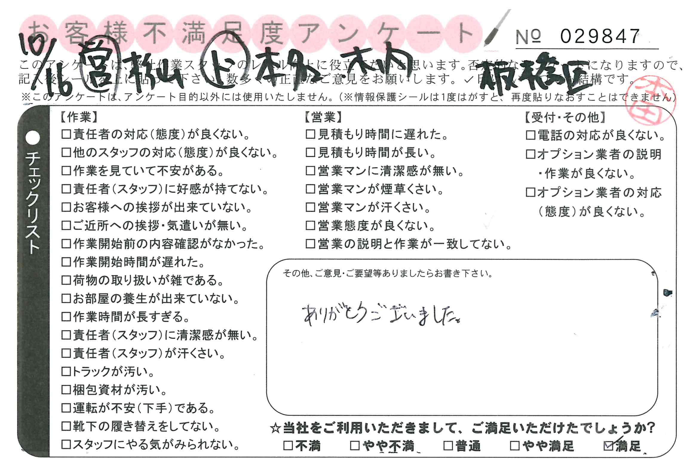 引越一番でお引越しをしていただいたお客様のうち、コメントいただいたアンケートを全て掲載しています。