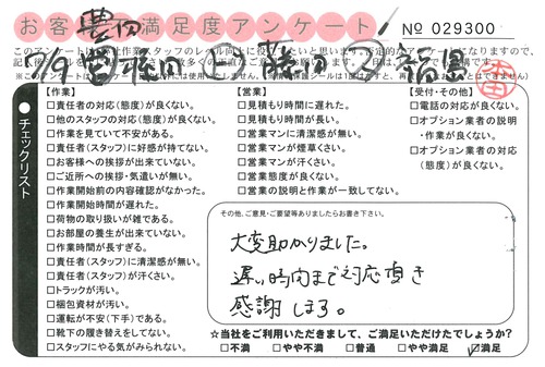 5/31 引越 営業:名田 ドライバー:藤田 スタッフ:長谷* 大変良くしていただきました。ありがとうございました。