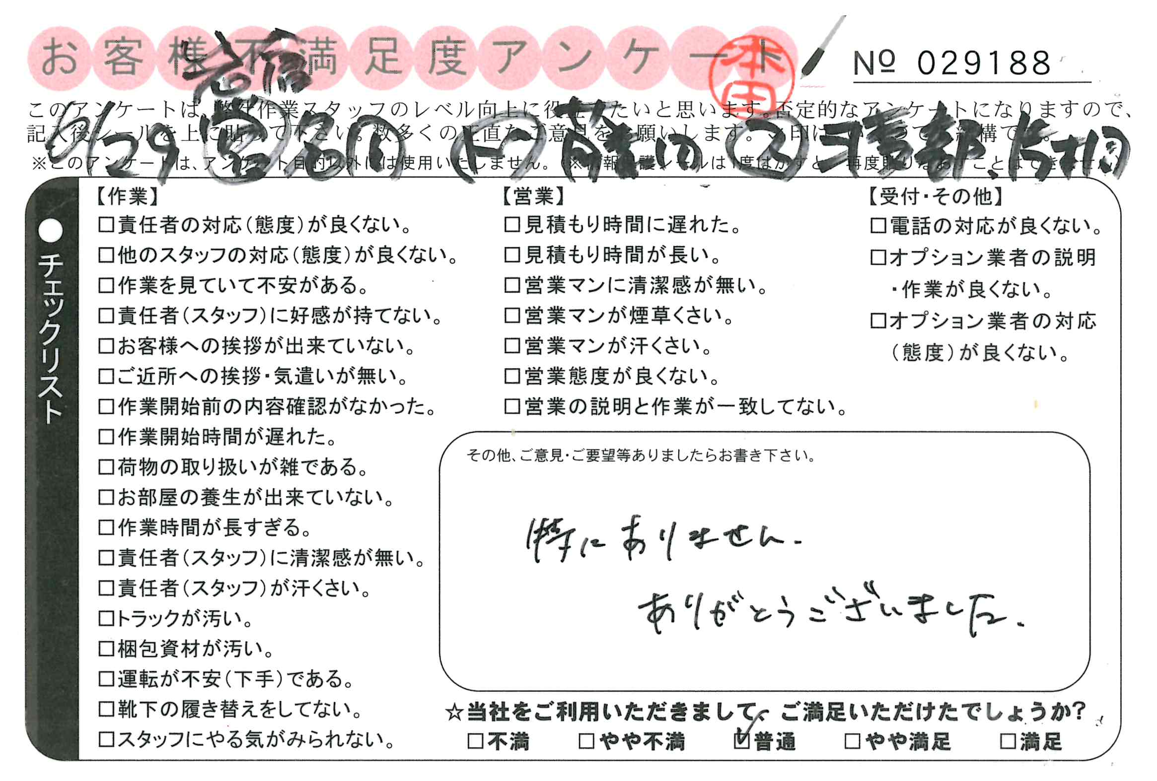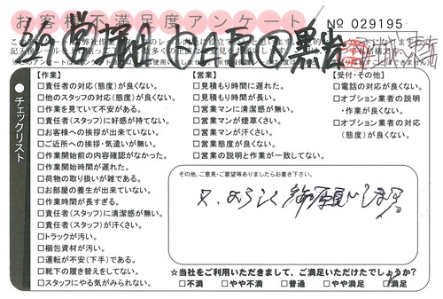 引越一番でお引越しをしていただいたお客様のうち、コメントいただいたアンケートを全て掲載しています。