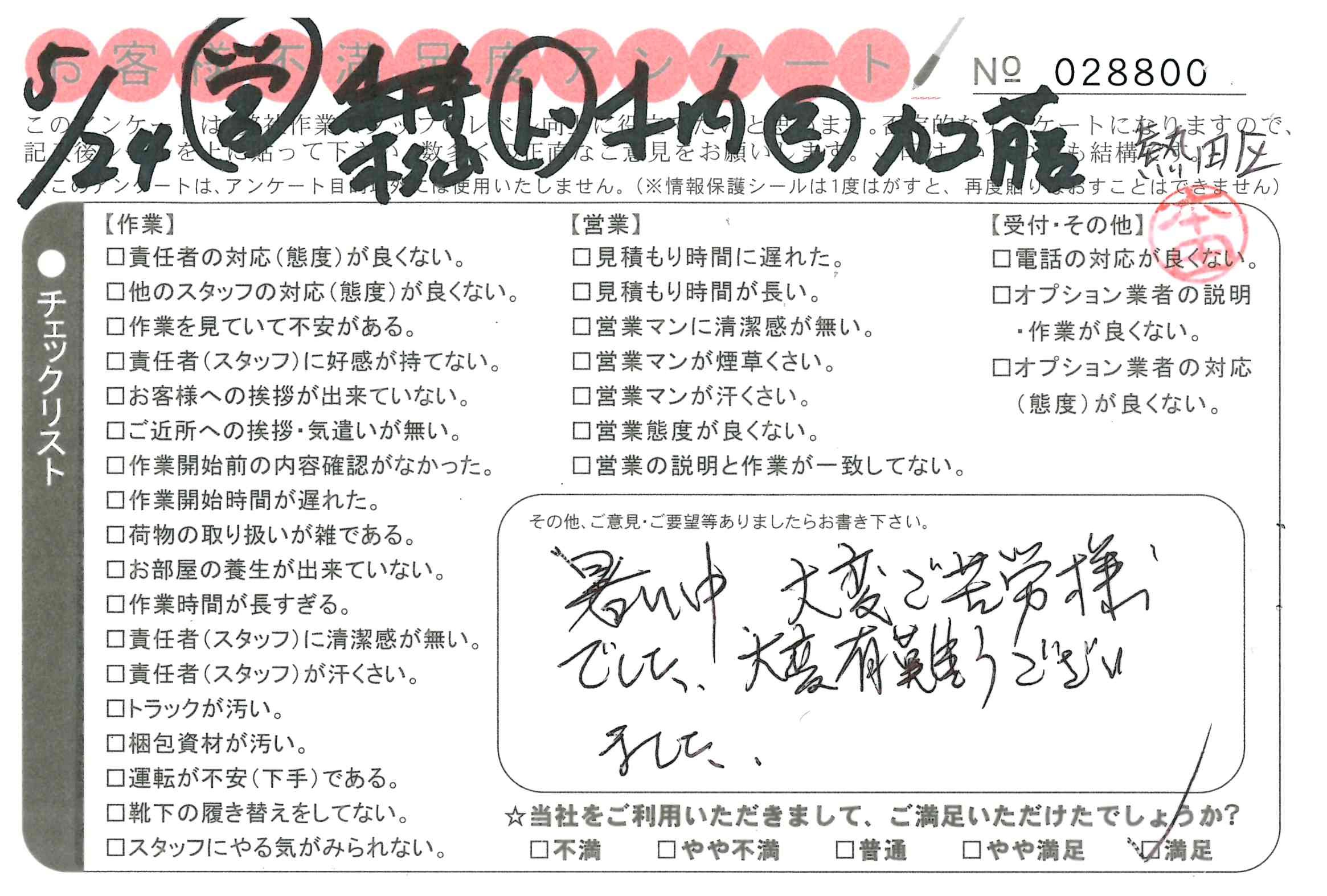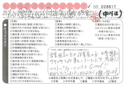 引越一番でお引越しをしていただいたお客様のうち、コメントいただいたアンケートを全て掲載しています。