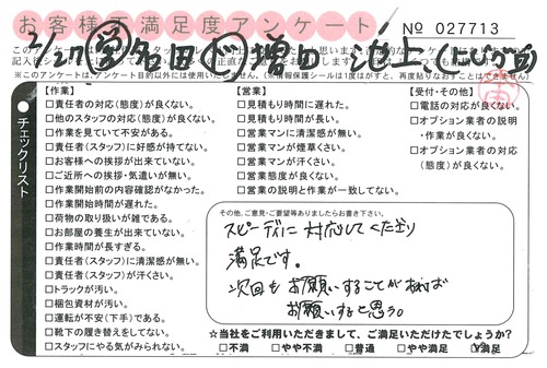 引越一番でお引越しをしていただいたお客様のうち、コメントいただいたアンケートを全て掲載しています。