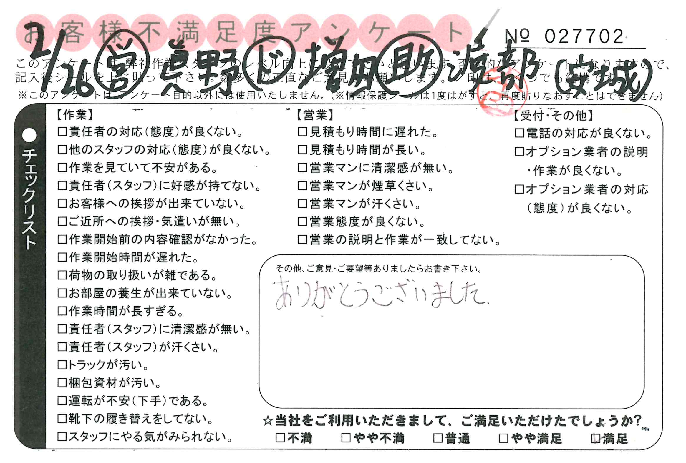 2/20 引越 営業:名田 ドライバー:本名 スタッフ:星野・池上* おつかれ様でした。ありがとうございました。