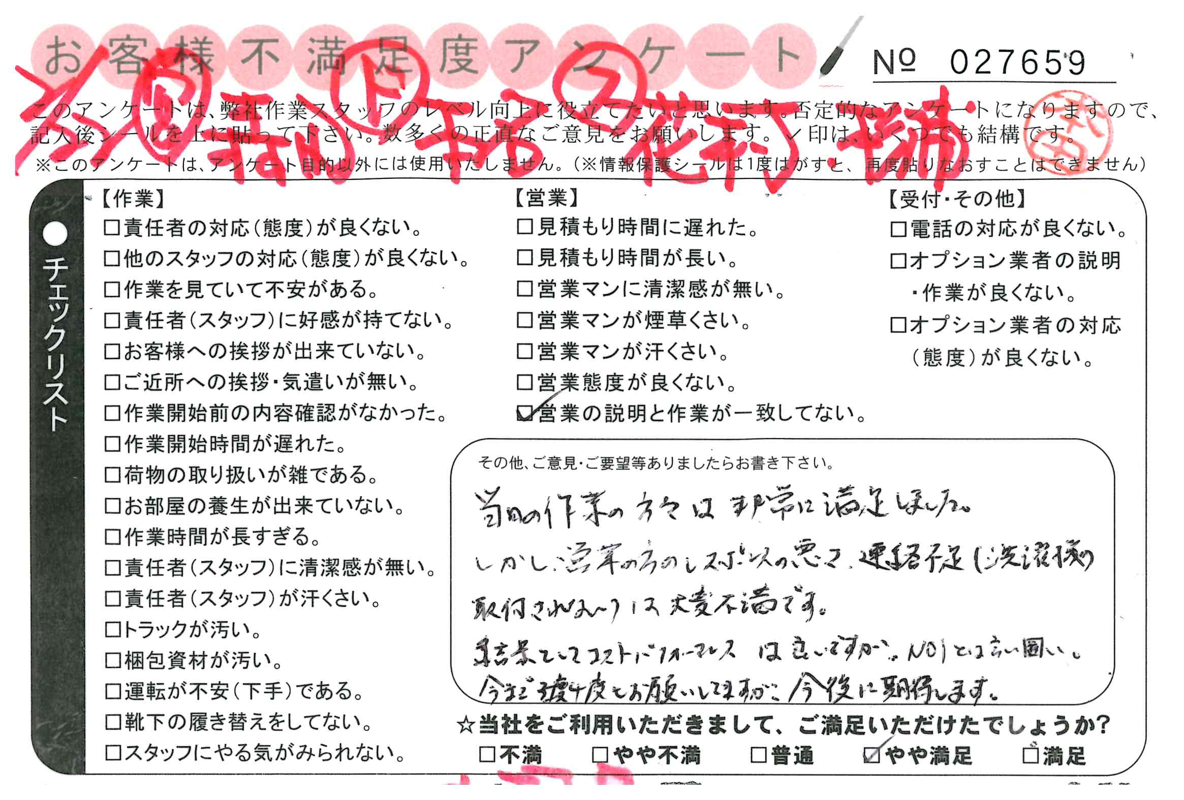 2/12 引越 営業:花村 ドライバー:米倉 スタッフ:渡部・星野* 全体的に満足致しました。御苦労様でした。