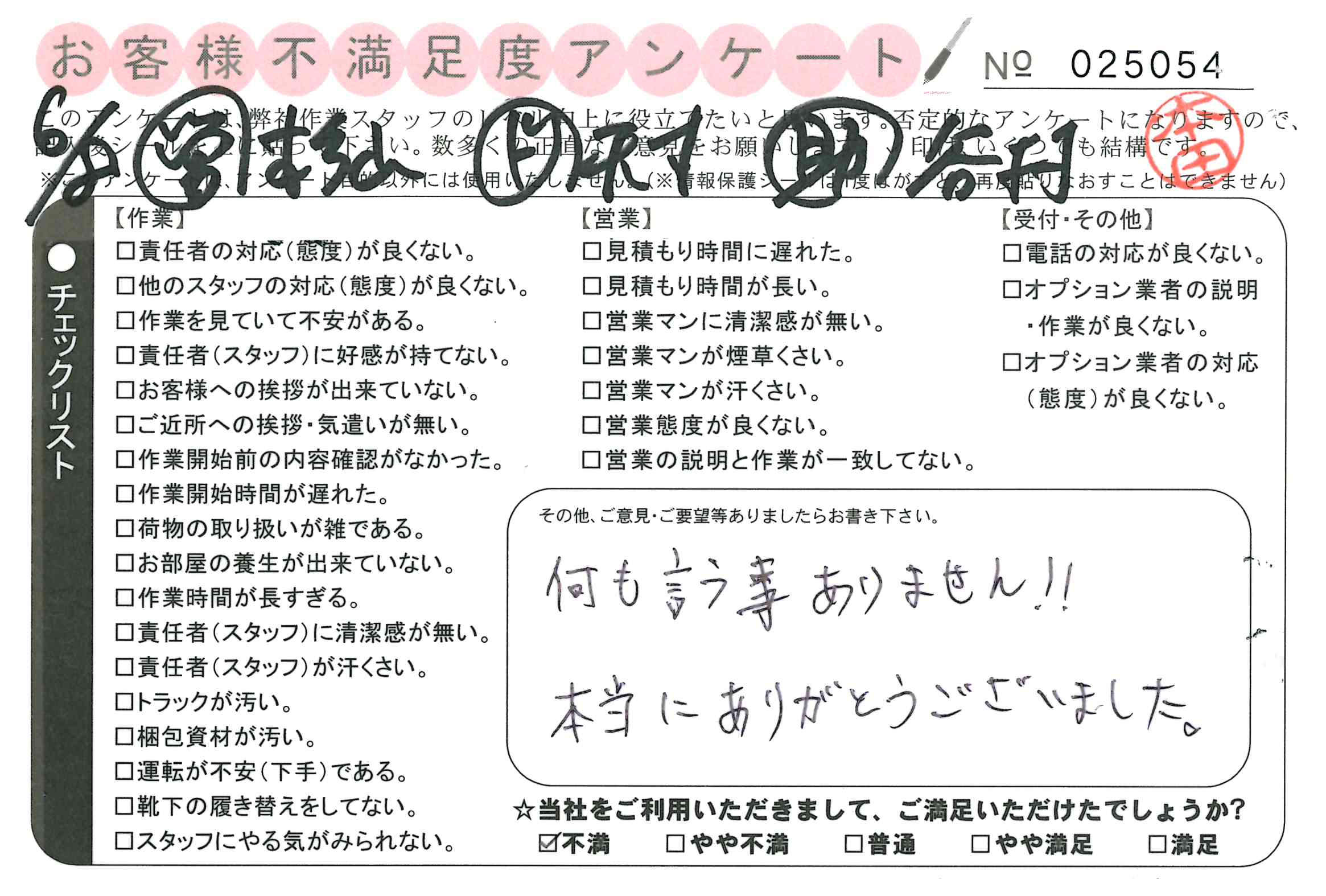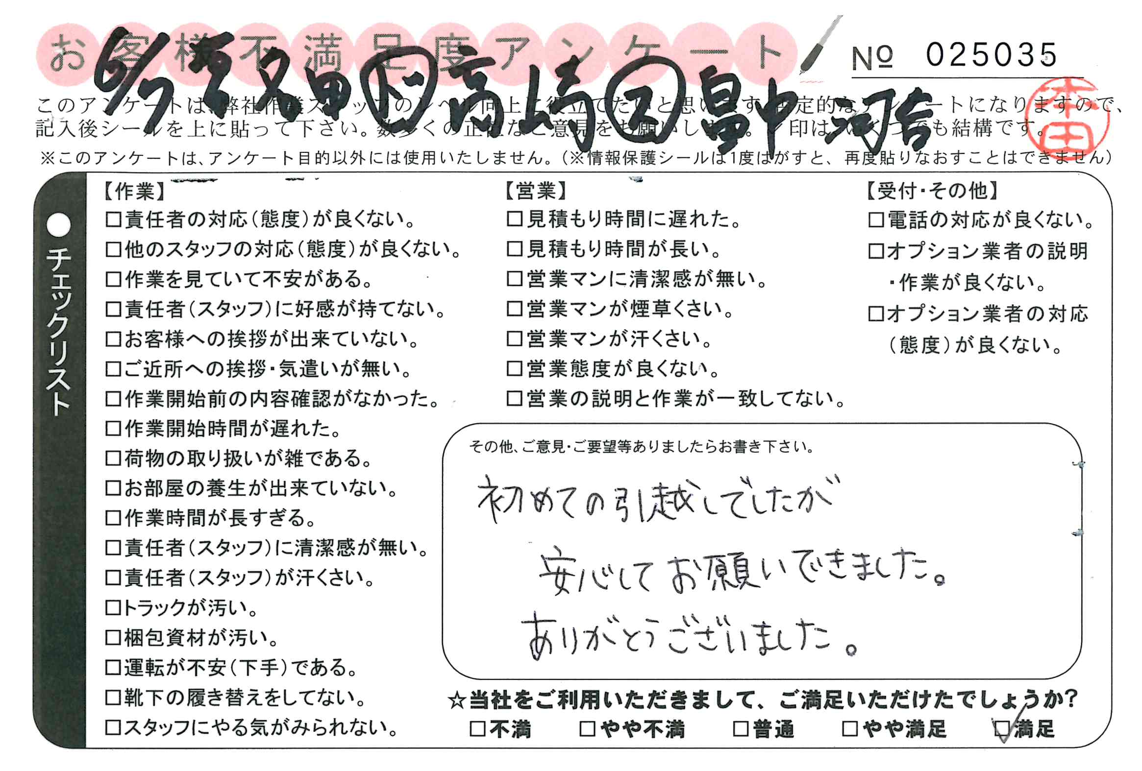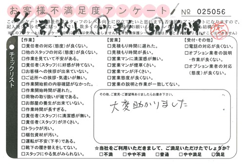 引越一番でお引越しをしていただいたお客様のうち、コメントいただいたアンケートを全て掲載しています。