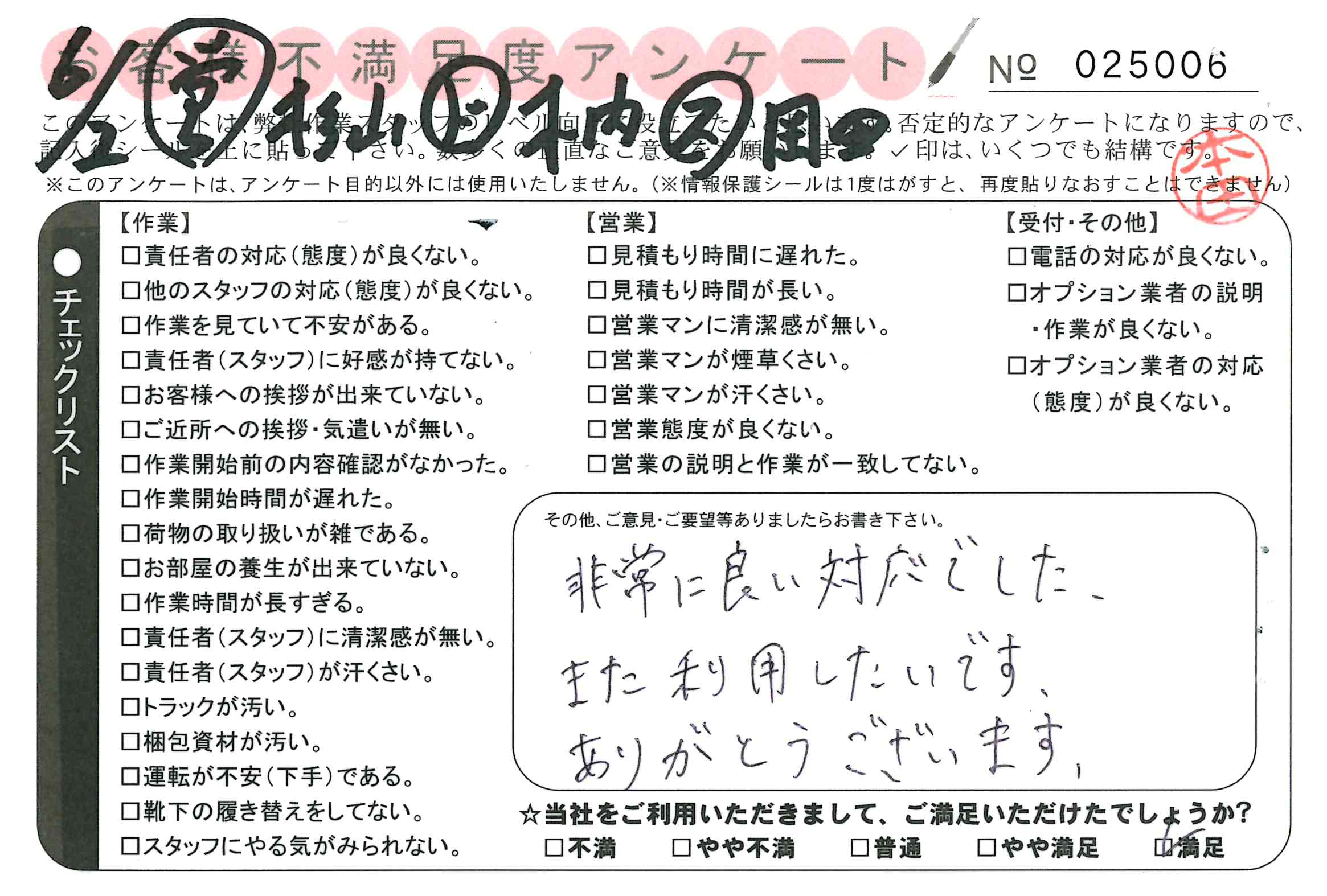 引越一番でお引越しをしていただいたお客様のうち、コメントいただいたアンケートを全て掲載しています。