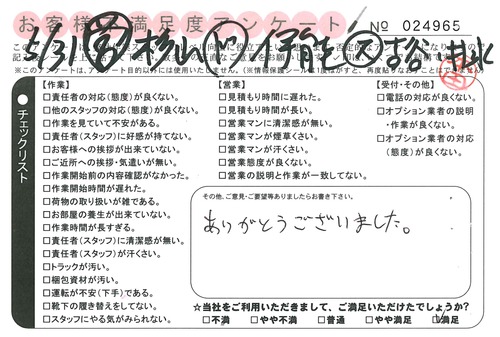 引越一番でお引越しをしていただいたお客様のうち、コメントいただいたアンケートを全て掲載しています。