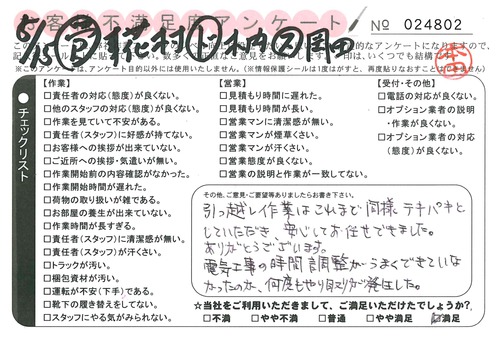 引越一番でお引越しをしていただいたお客様のうち、コメントいただいたアンケートを全て掲載しています。