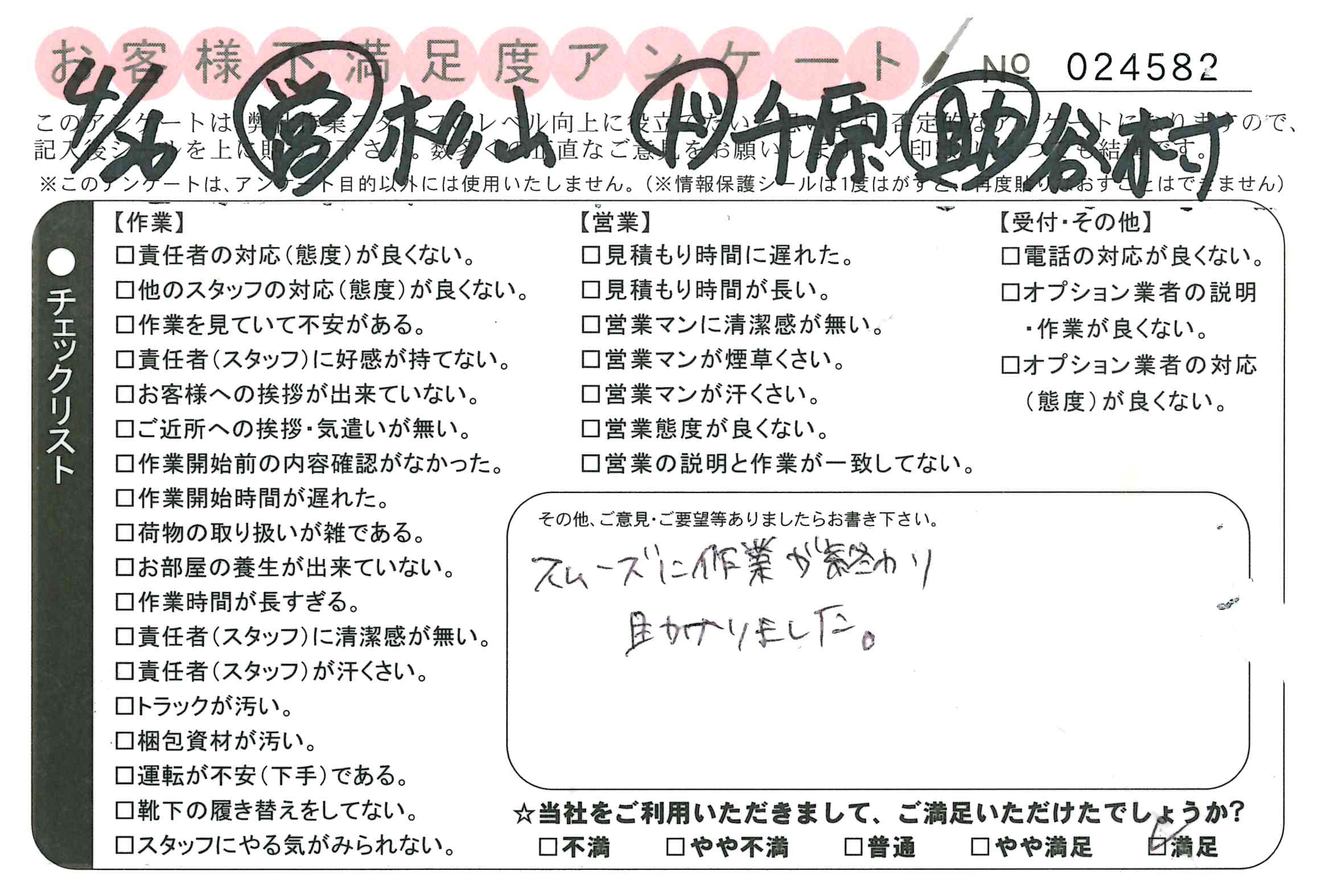 * 不安なくていねいに仕事していただき、不満なく満足しております。
