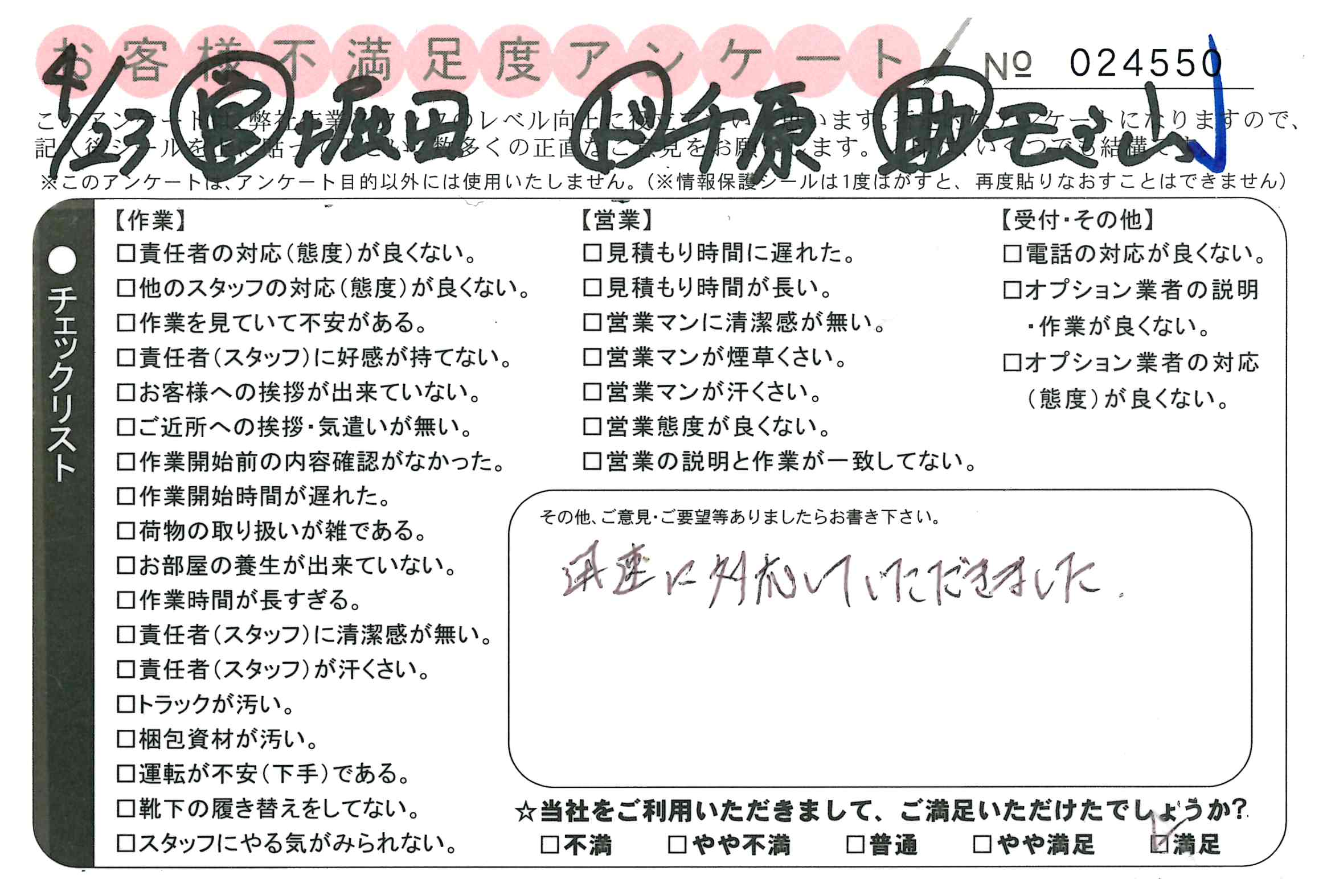 引越一番でお引越しをしていただいたお客様のうち、コメントいただいたアンケートを全て掲載しています。
