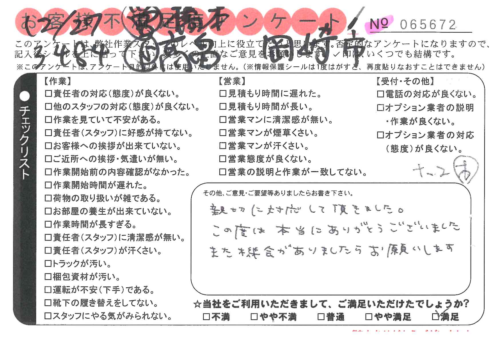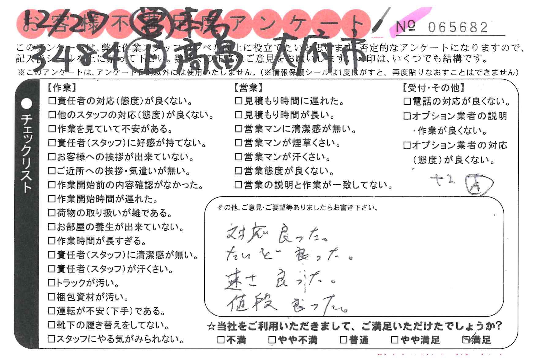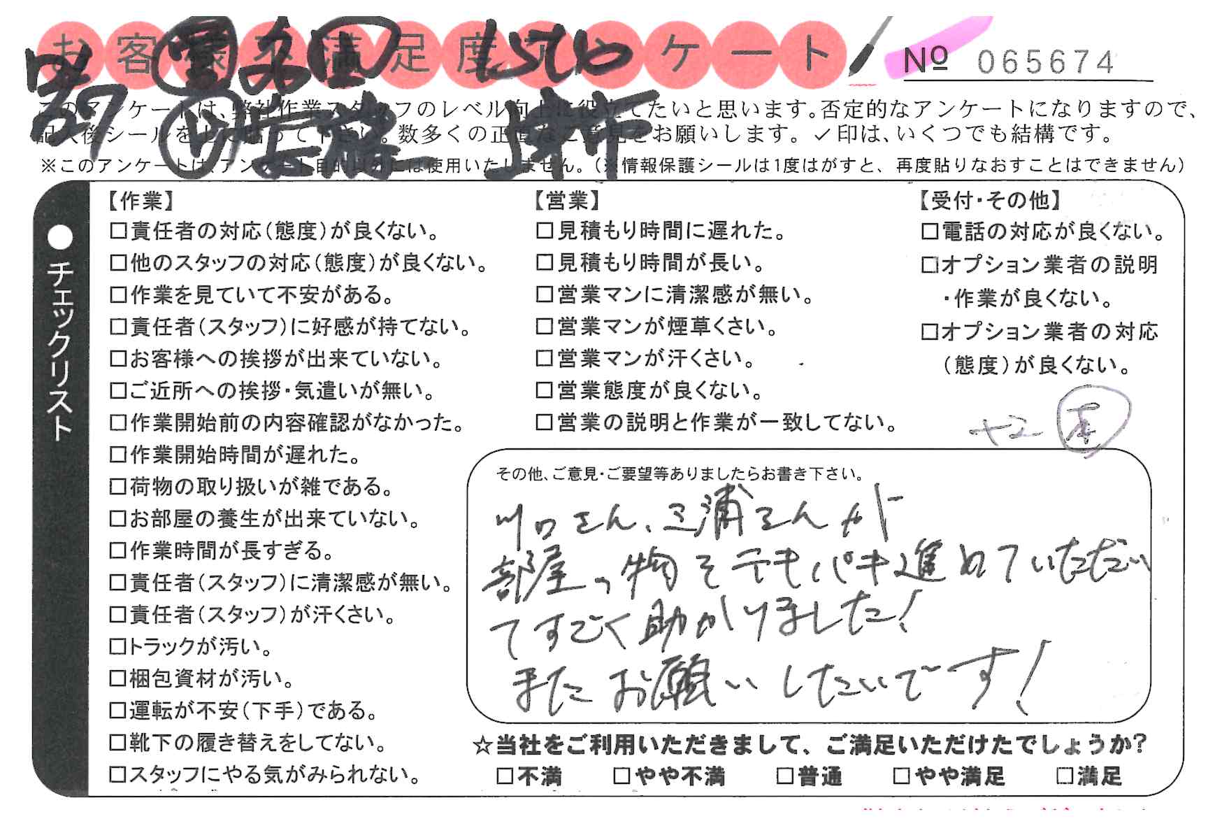 引越一番でお引越しをしていただいたお客様のうち、コメントいただいたアンケートを全て掲載しています。