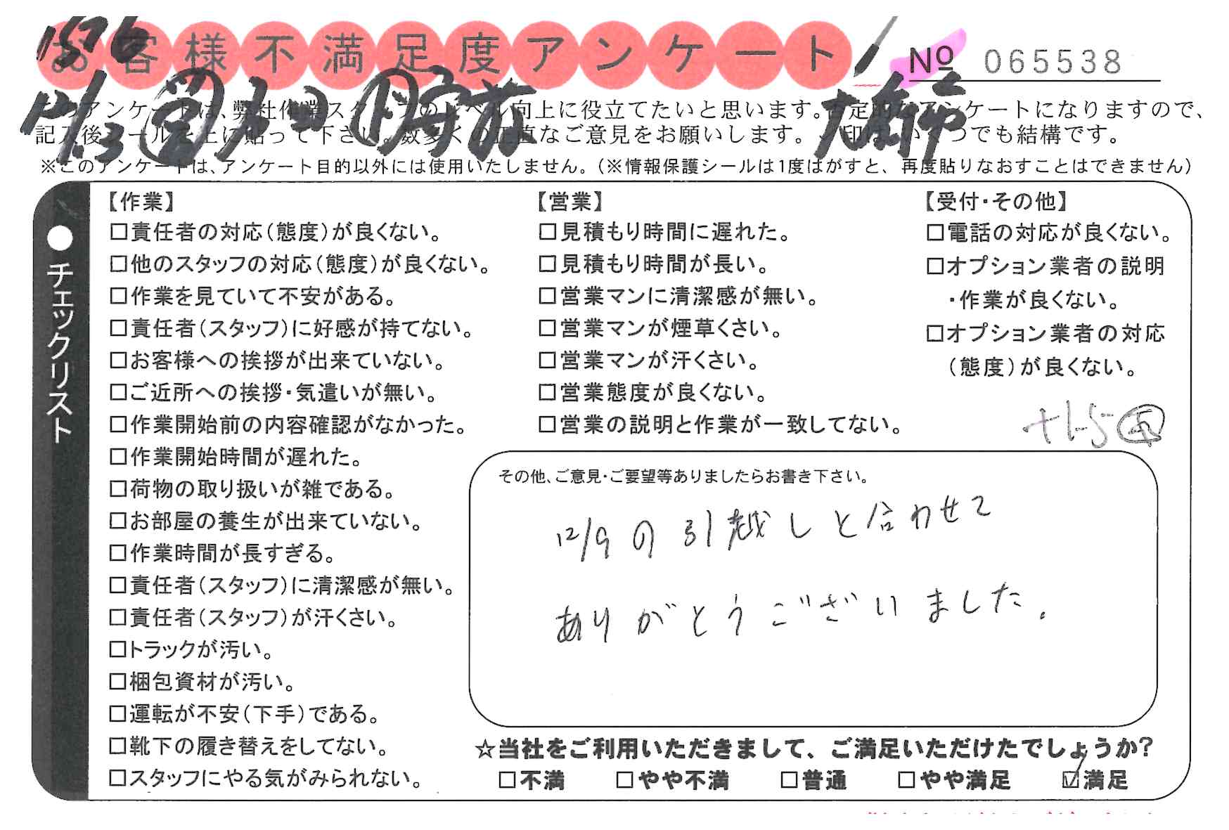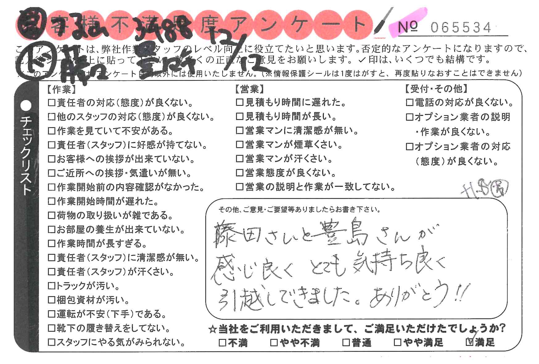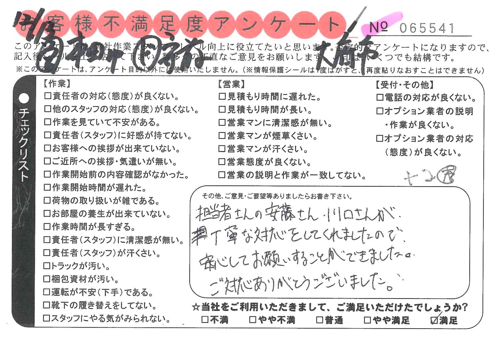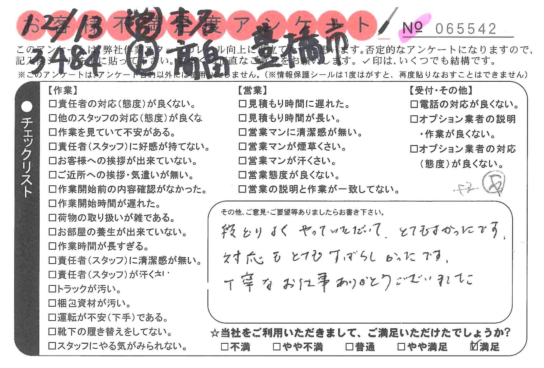 作業いただき満足しております。次、引越しする際も