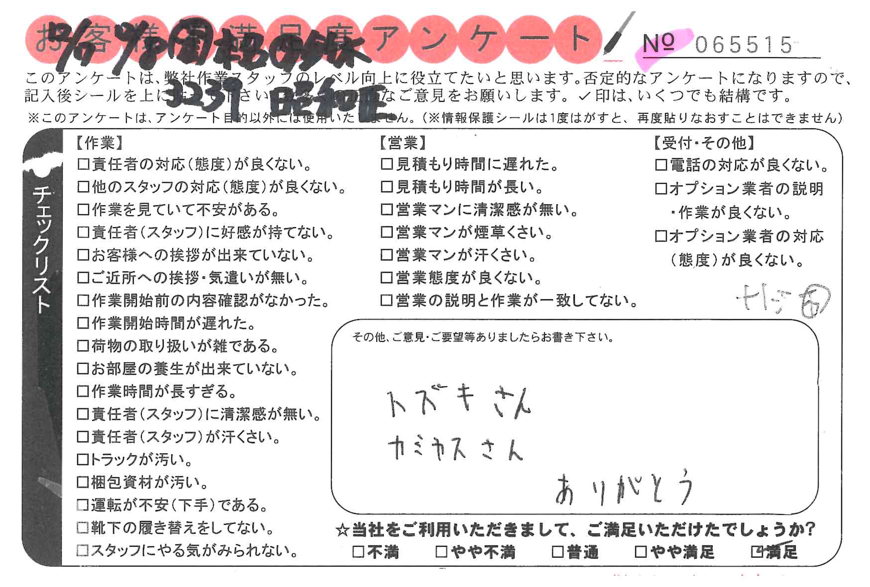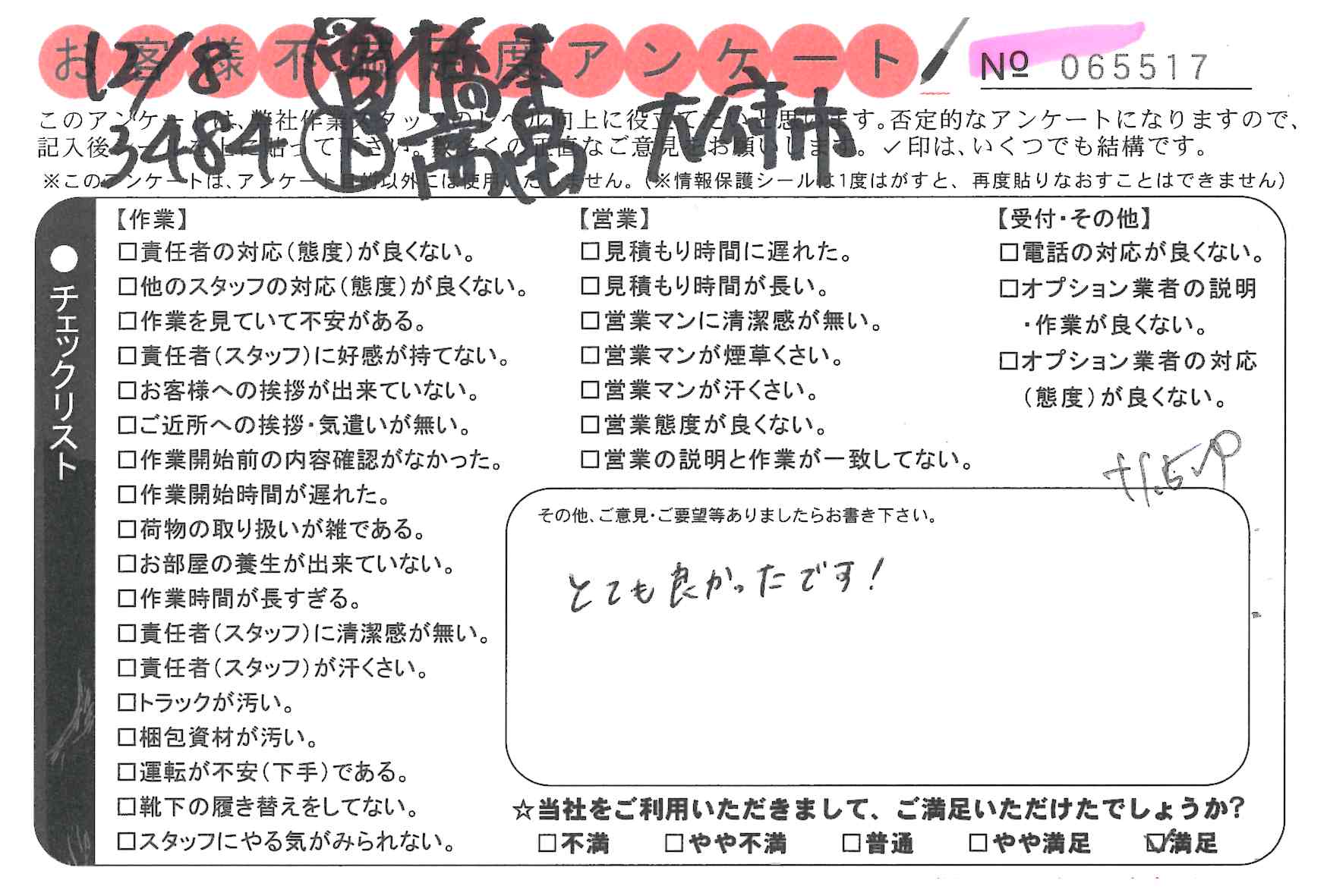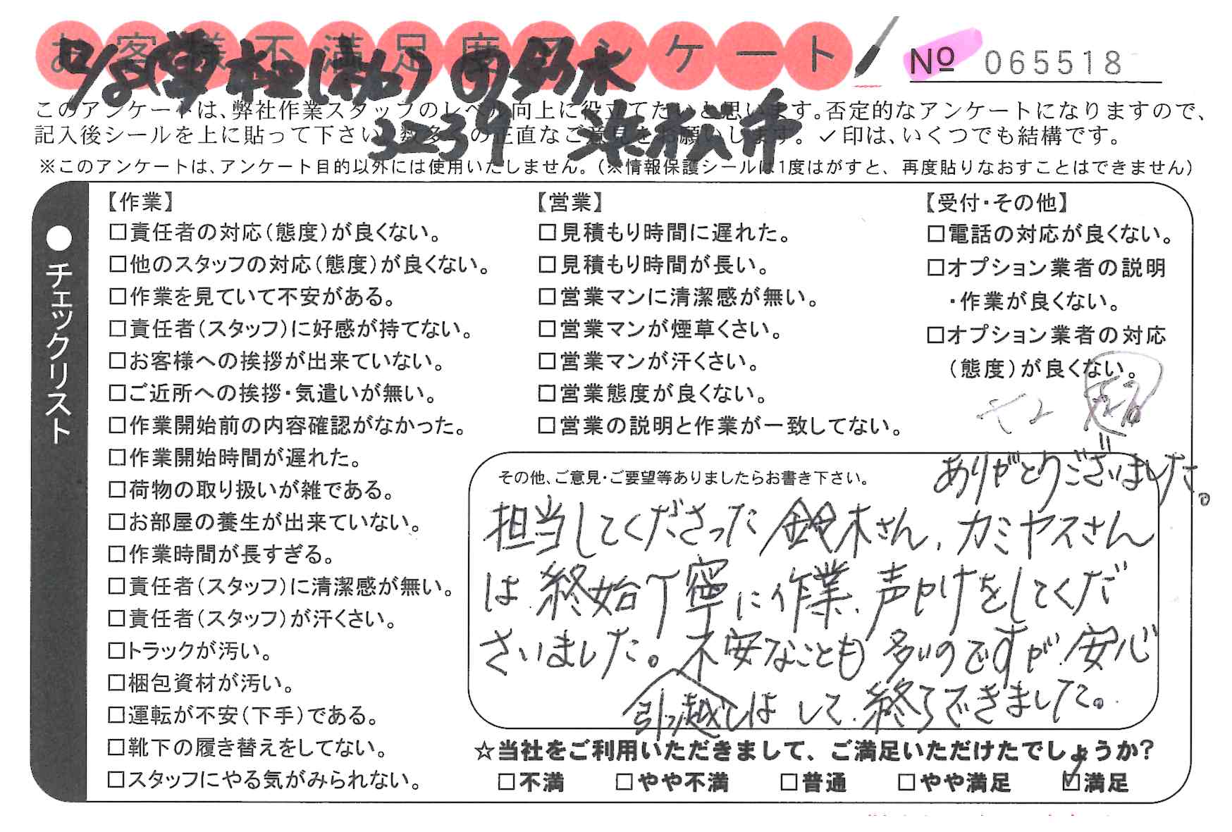 引越一番でお引越しをしていただいたお客様のうち、コメントいただいたアンケートを全て掲載しています。