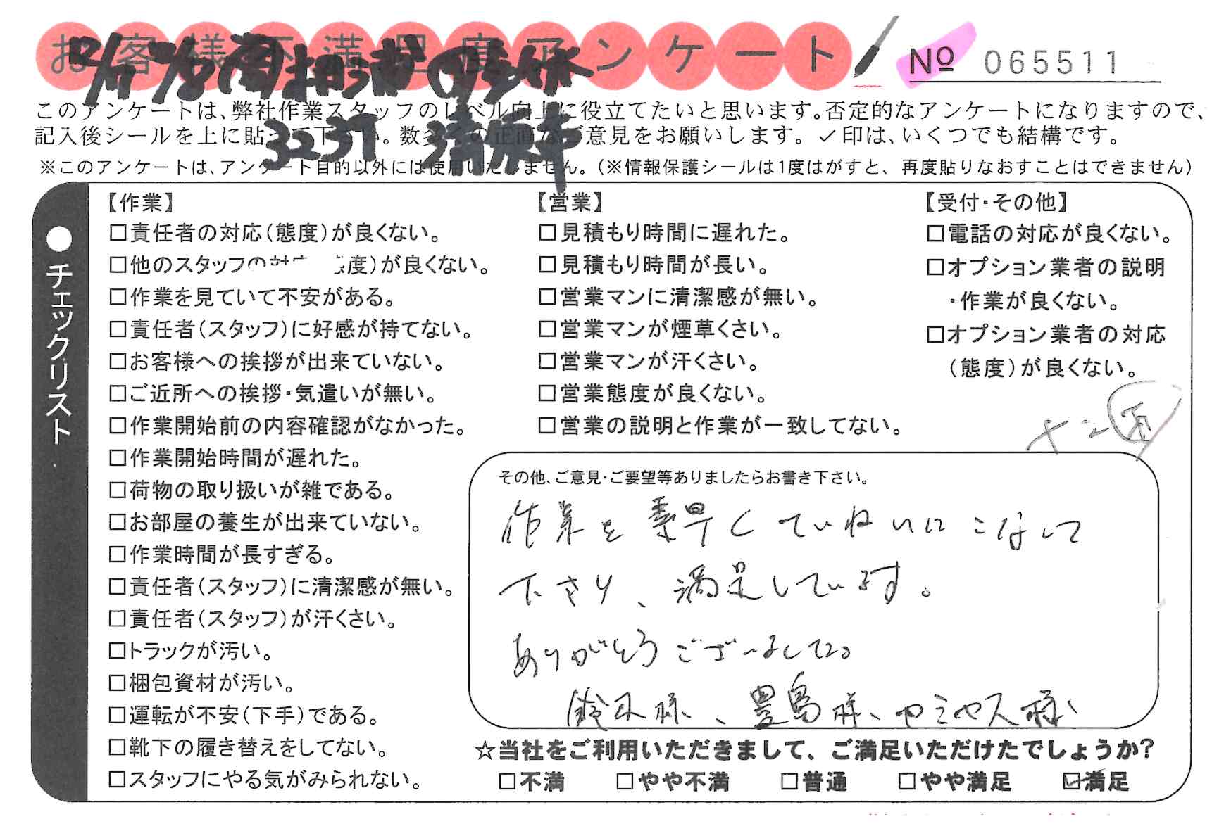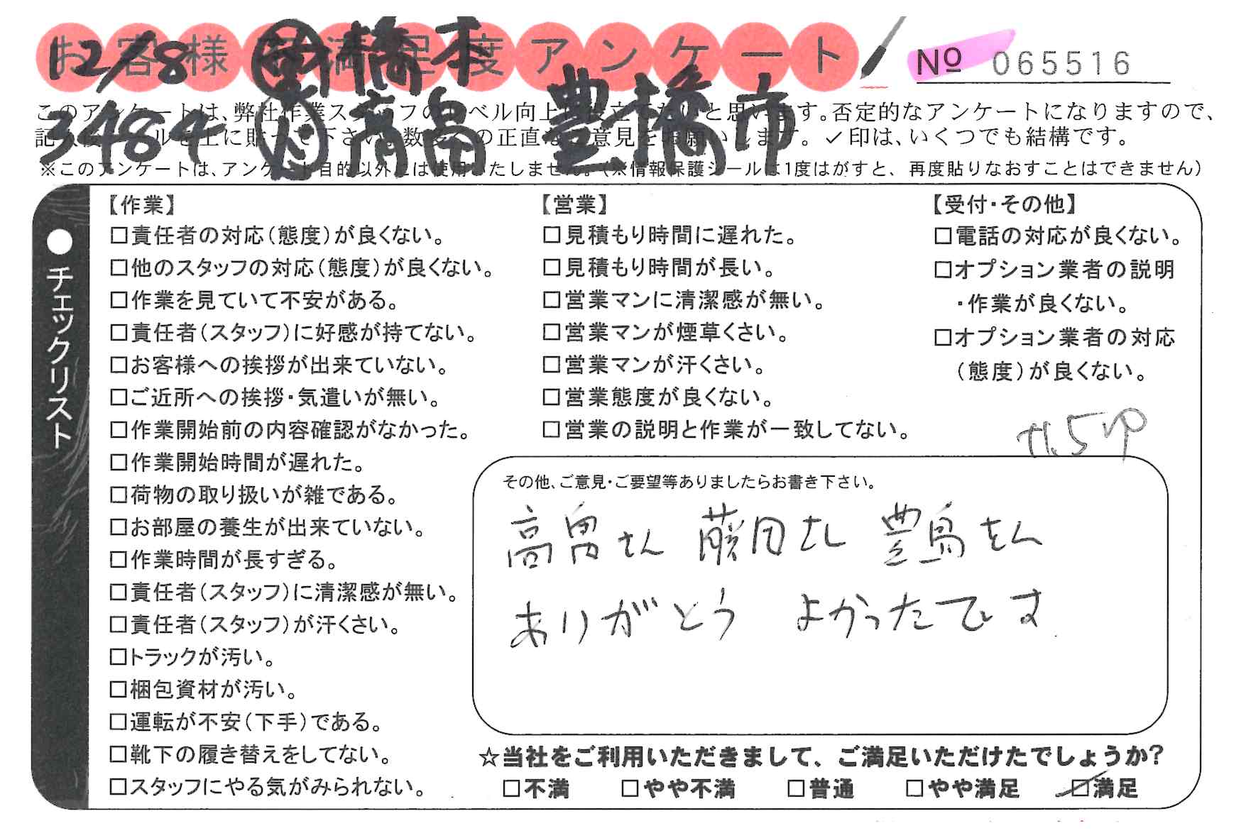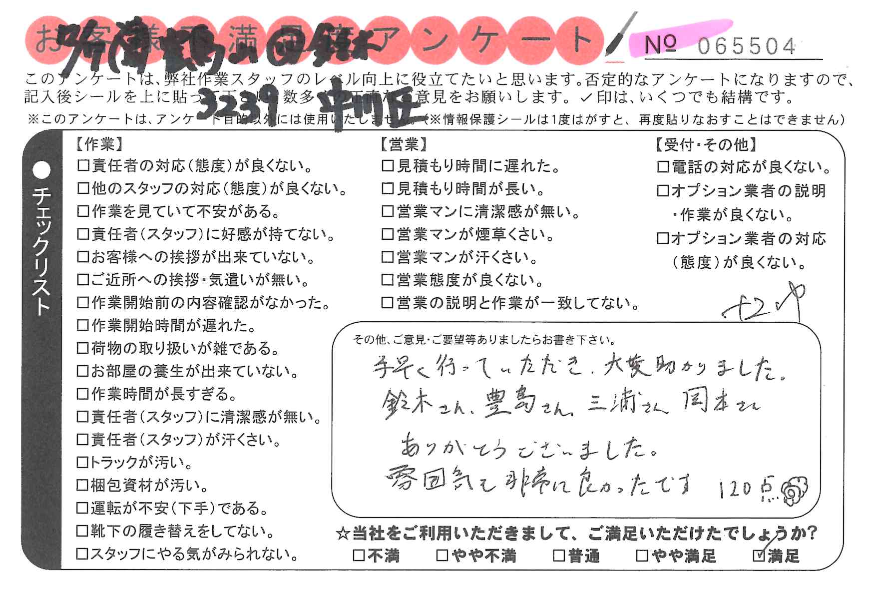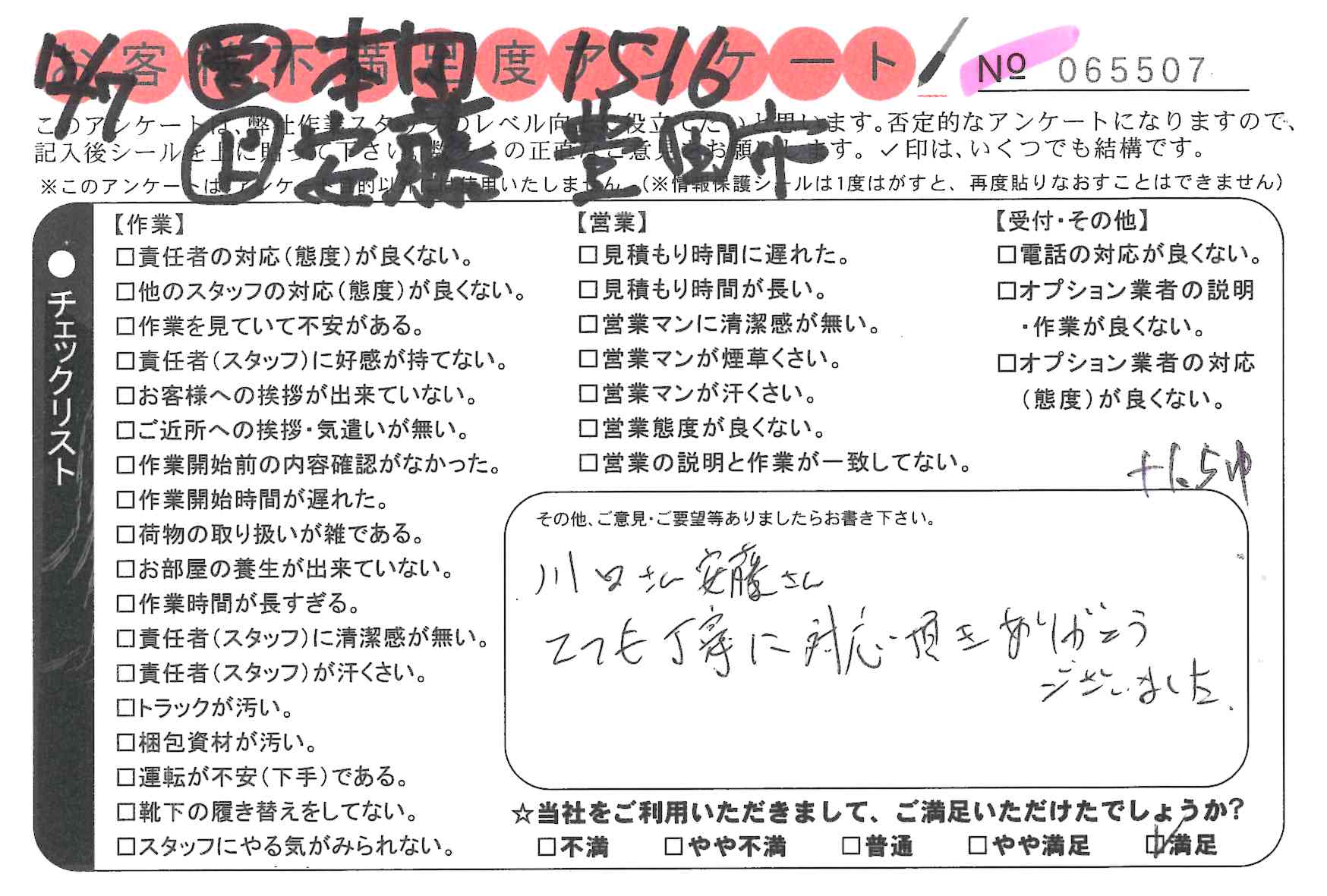 引越一番でお引越しをしていただいたお客様のうち、コメントいただいたアンケートを全て掲載しています。