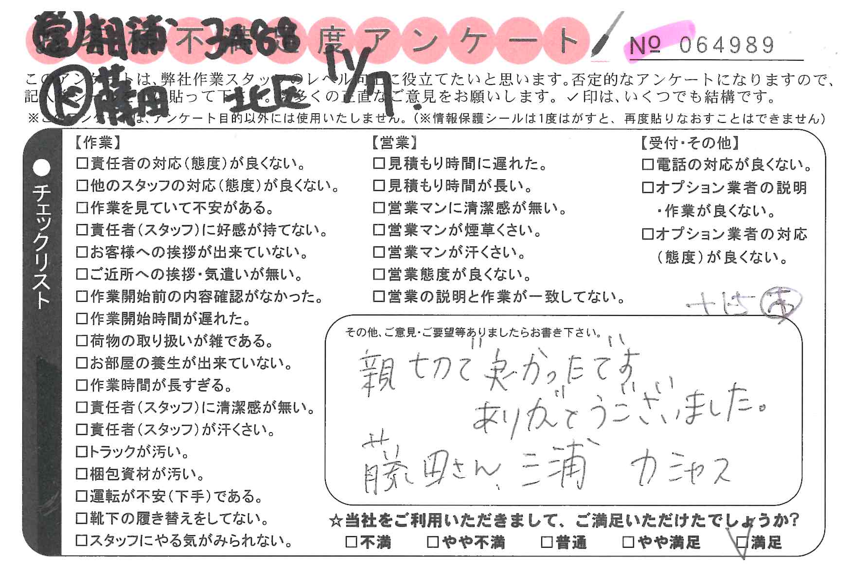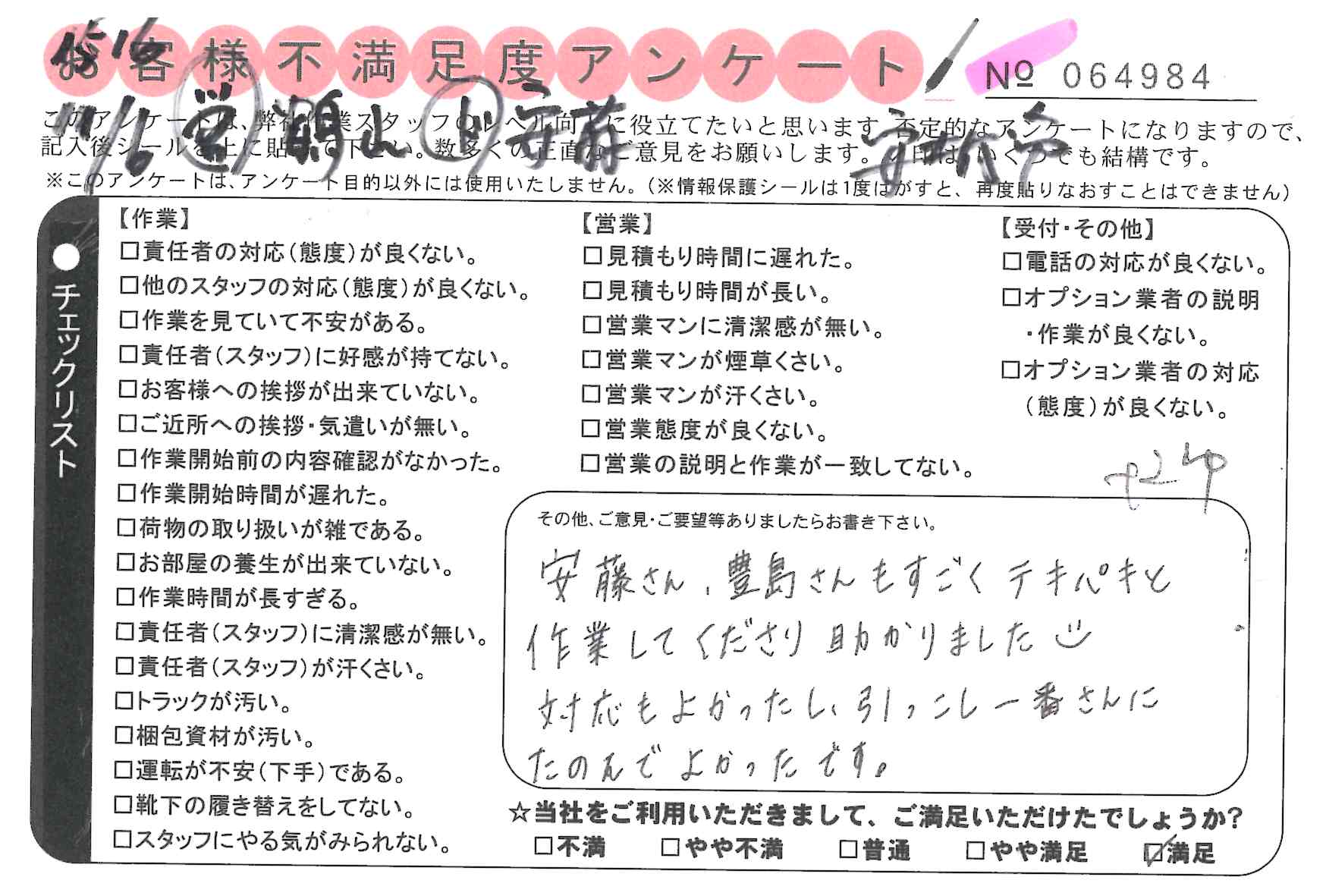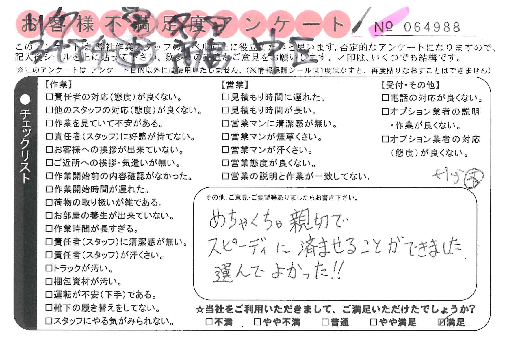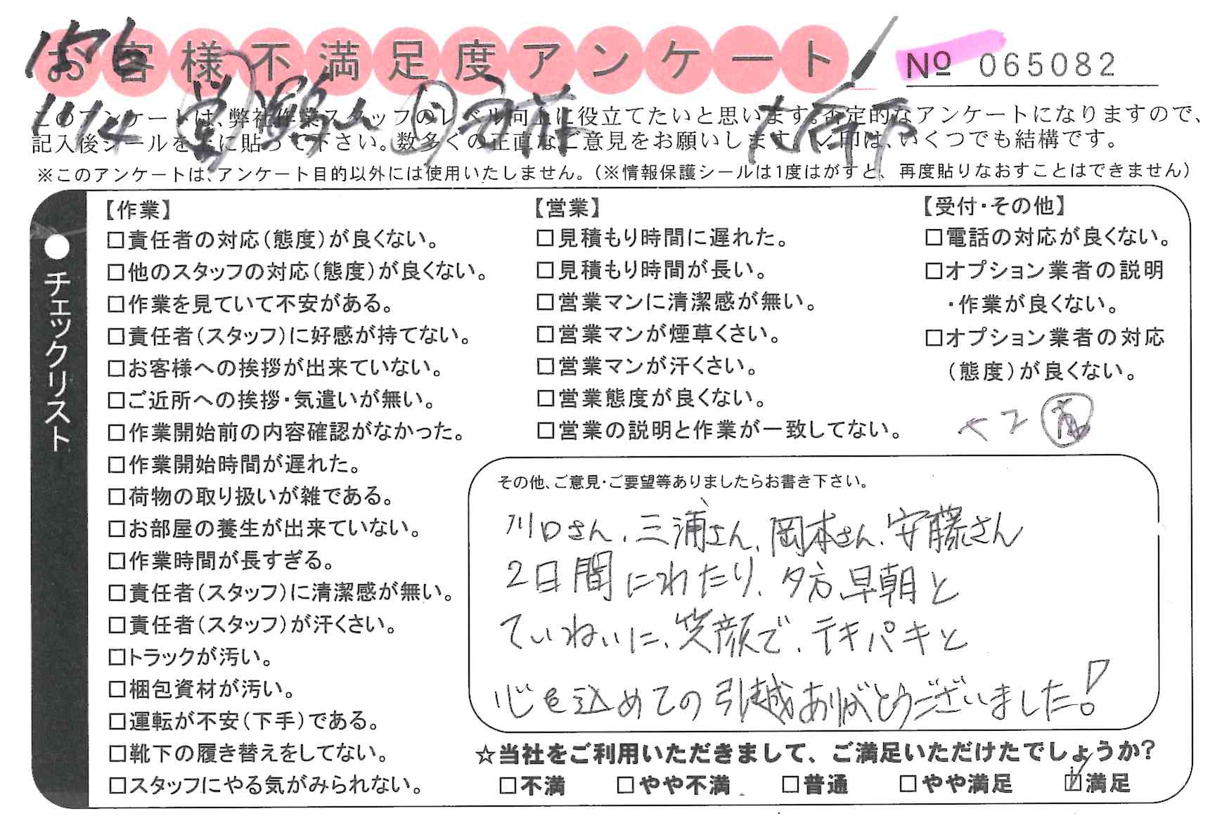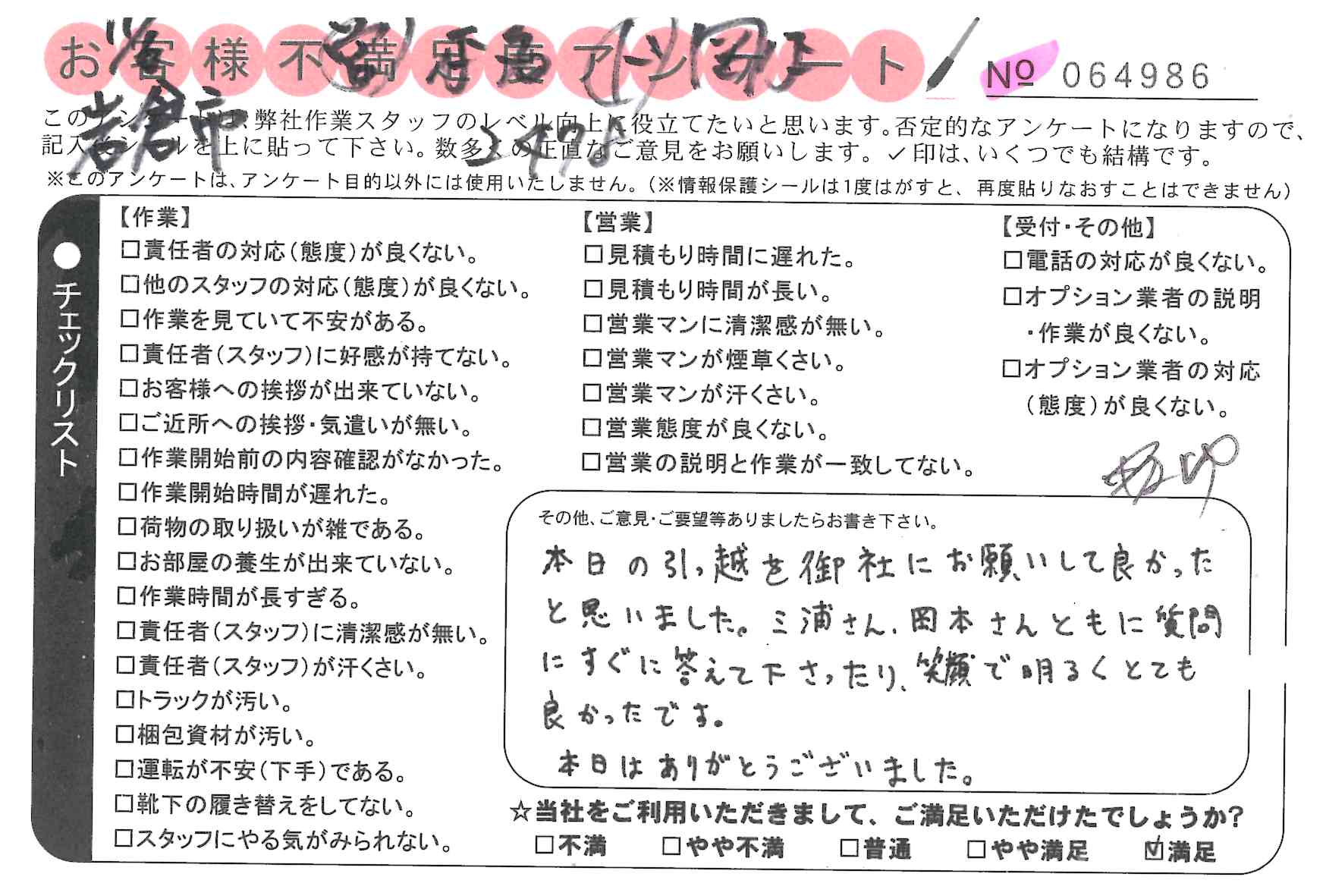 引越一番でお引越しをしていただいたお客様のうち、コメントいただいたアンケートを全て掲載しています。