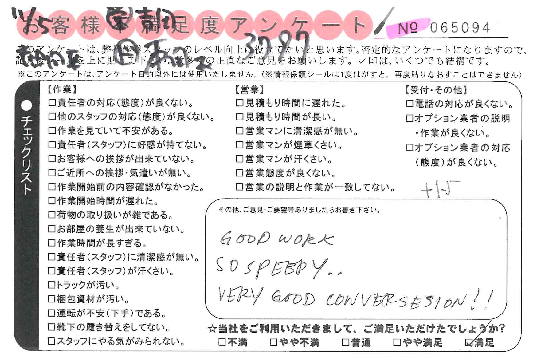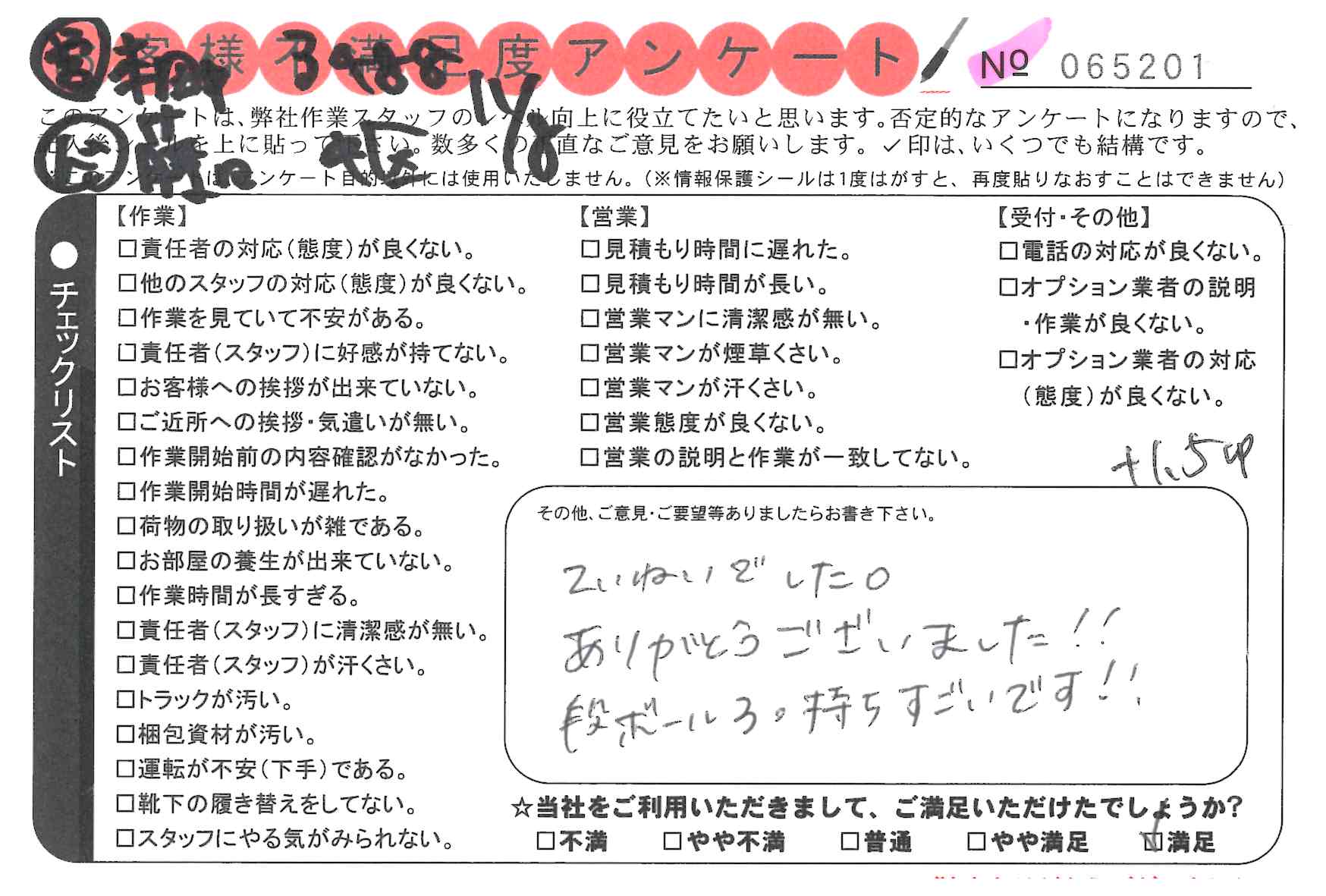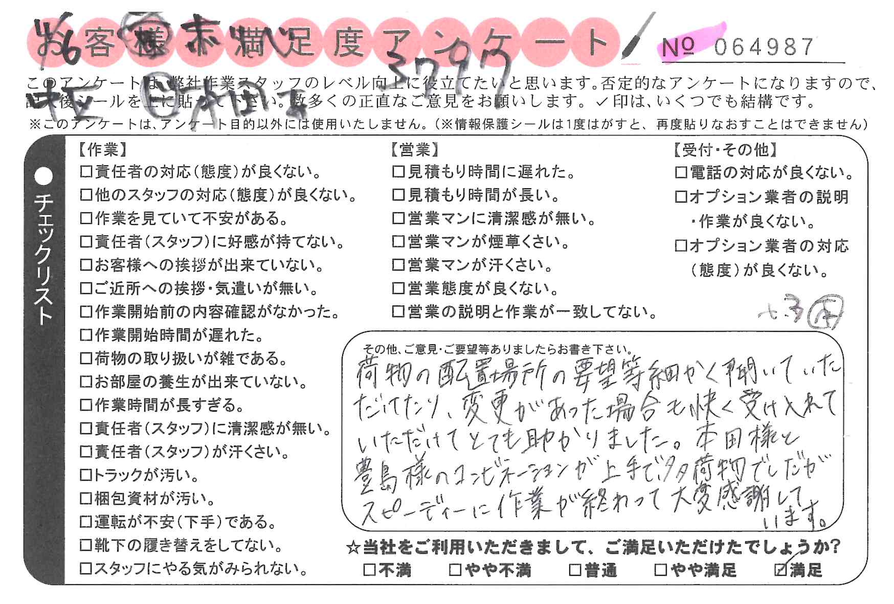 * 本日の引っ越しを御社にお願いしてよかったと思いました。