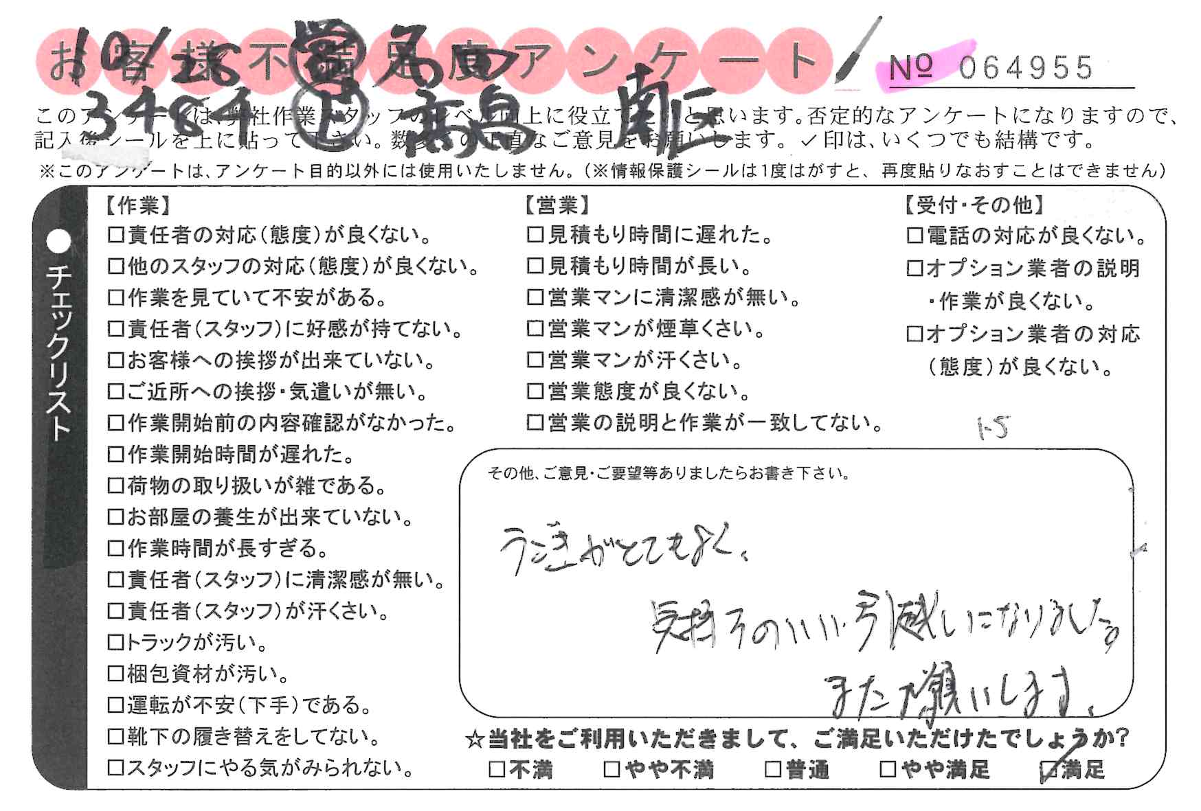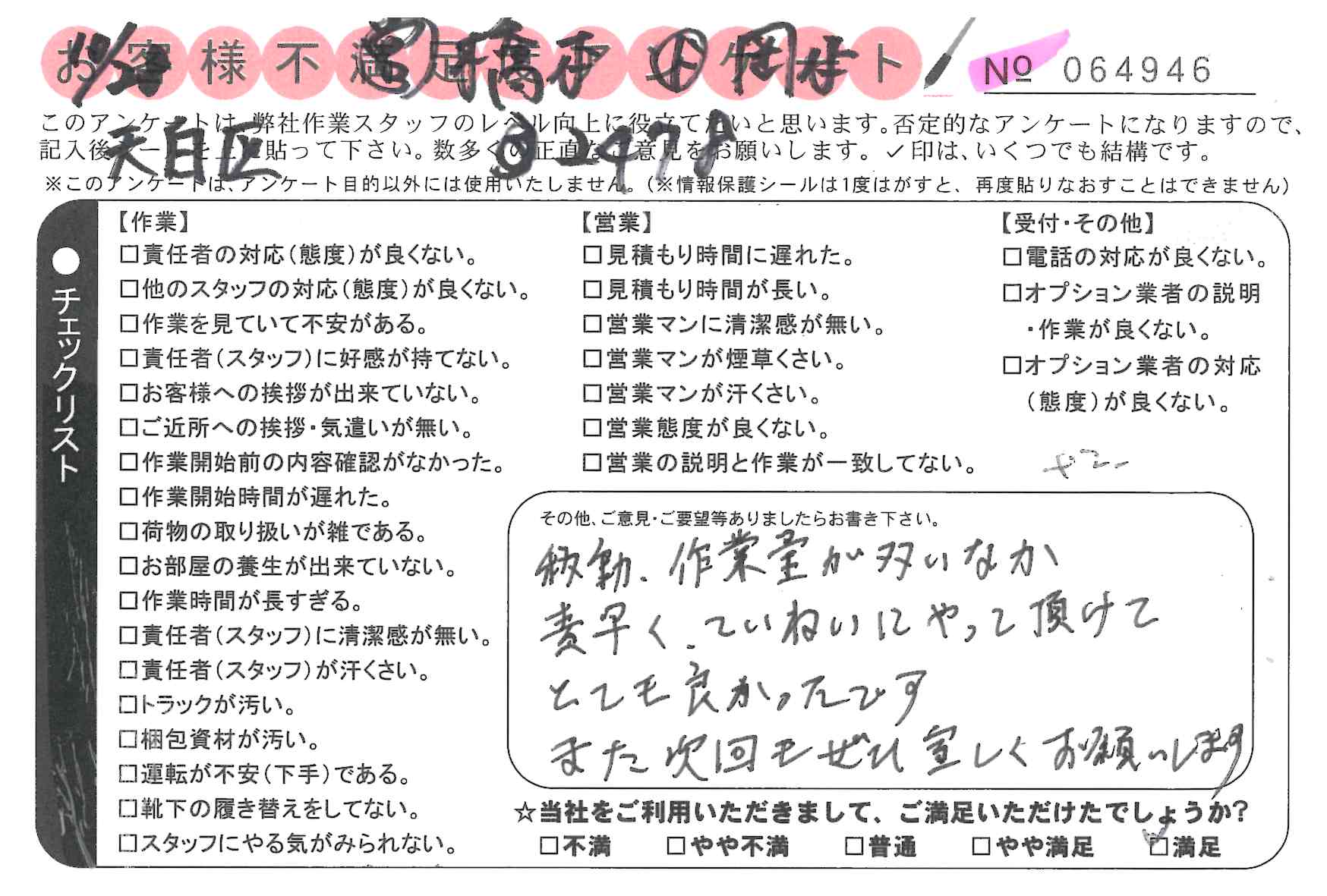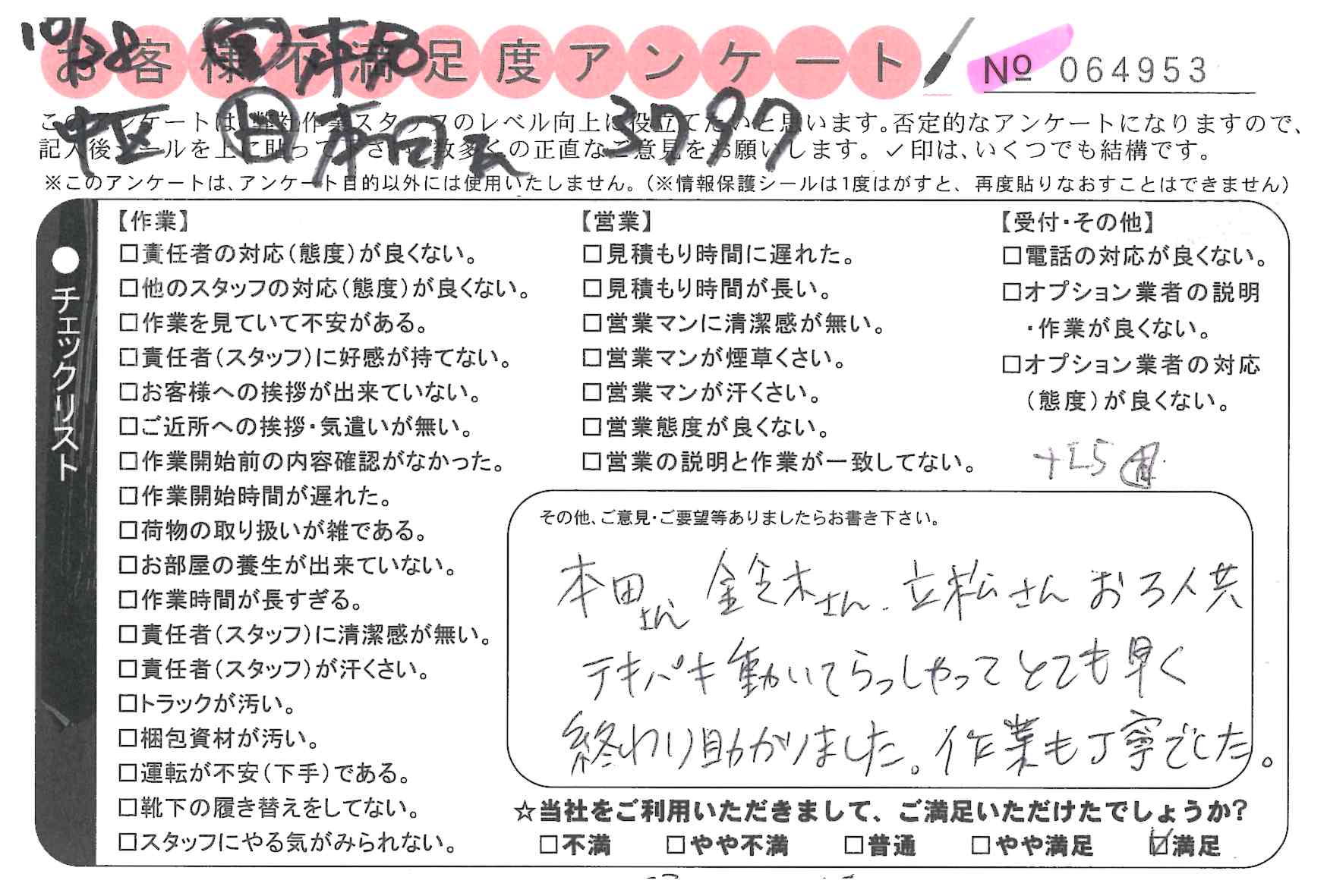 引越一番でお引越しをしていただいたお客様のうち、コメントいただいたアンケートを全て掲載しています。