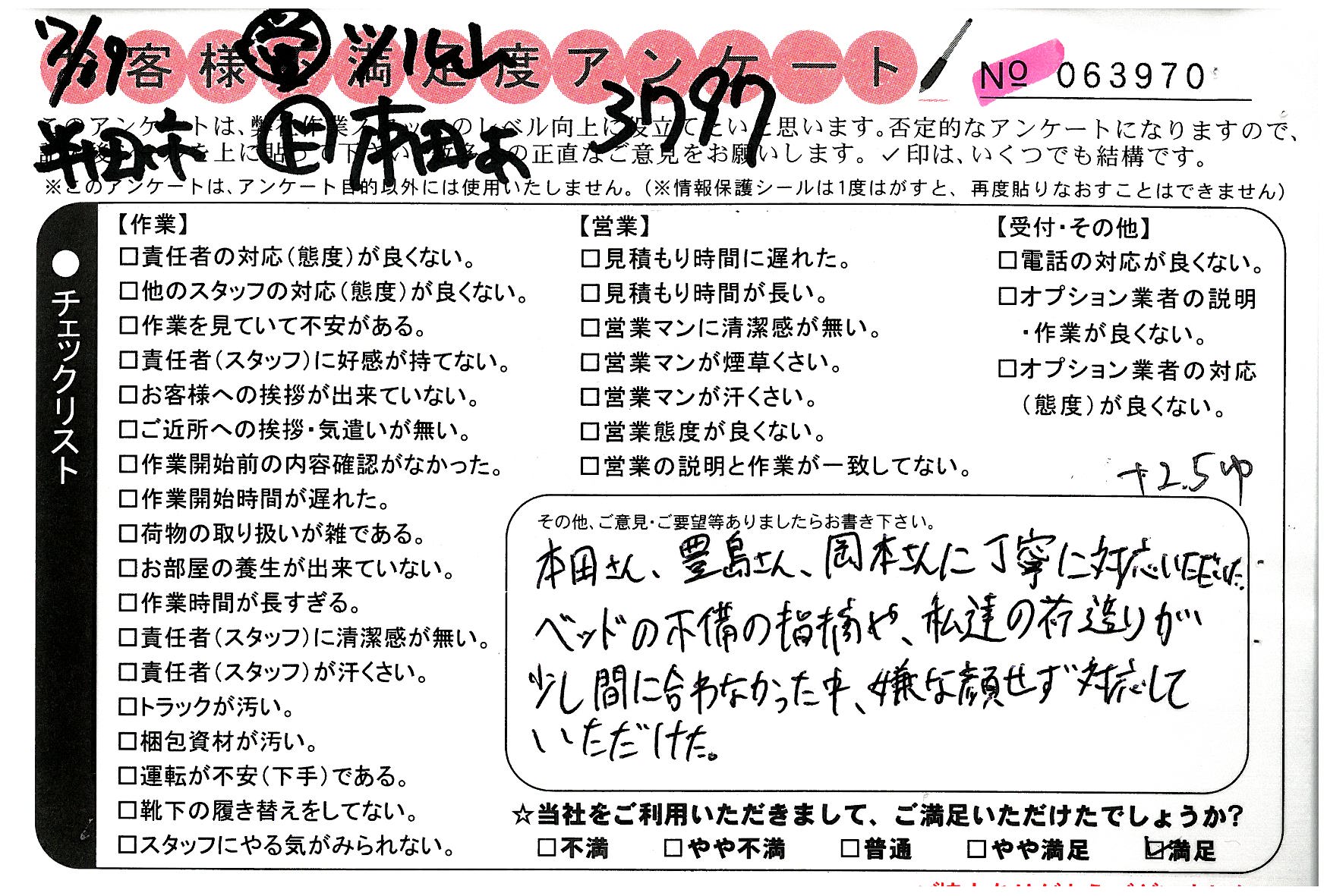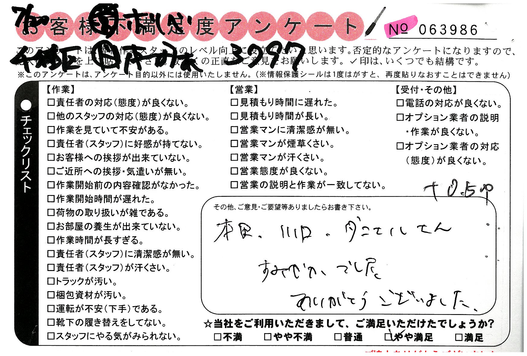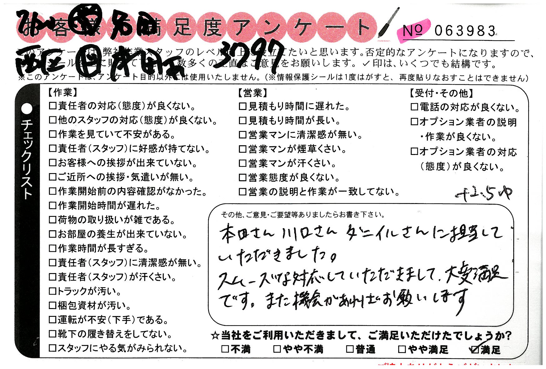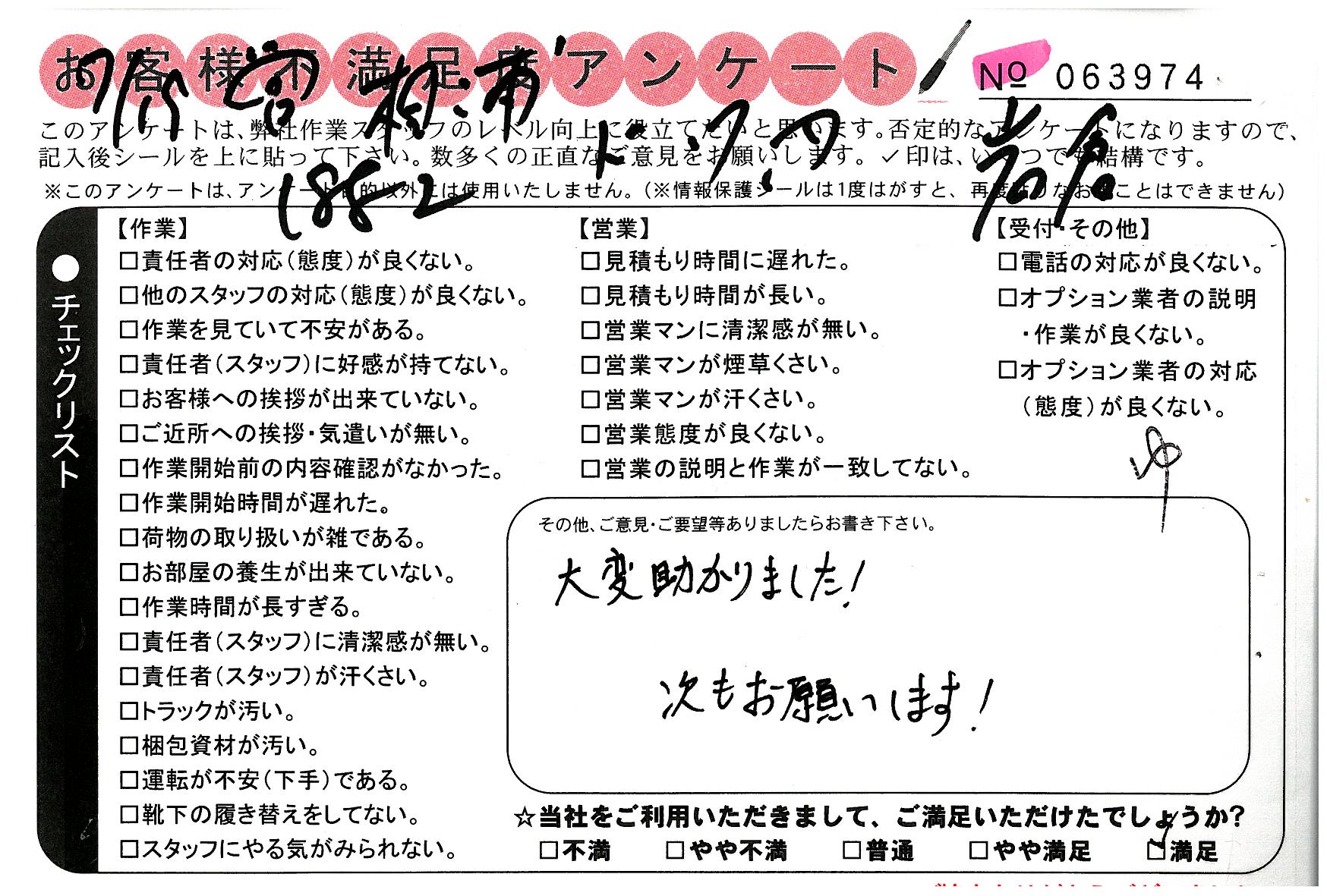 引越一番でお引越しをしていただいたお客様のうち、コメントいただいたアンケートを全て掲載しています。