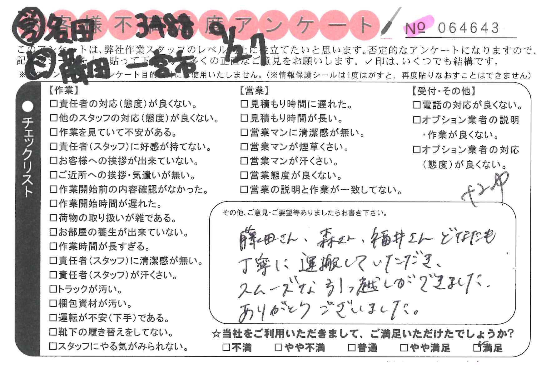 引越一番でお引越しをしていただいたお客様のうち、コメントいただいたアンケートを全て掲載しています。