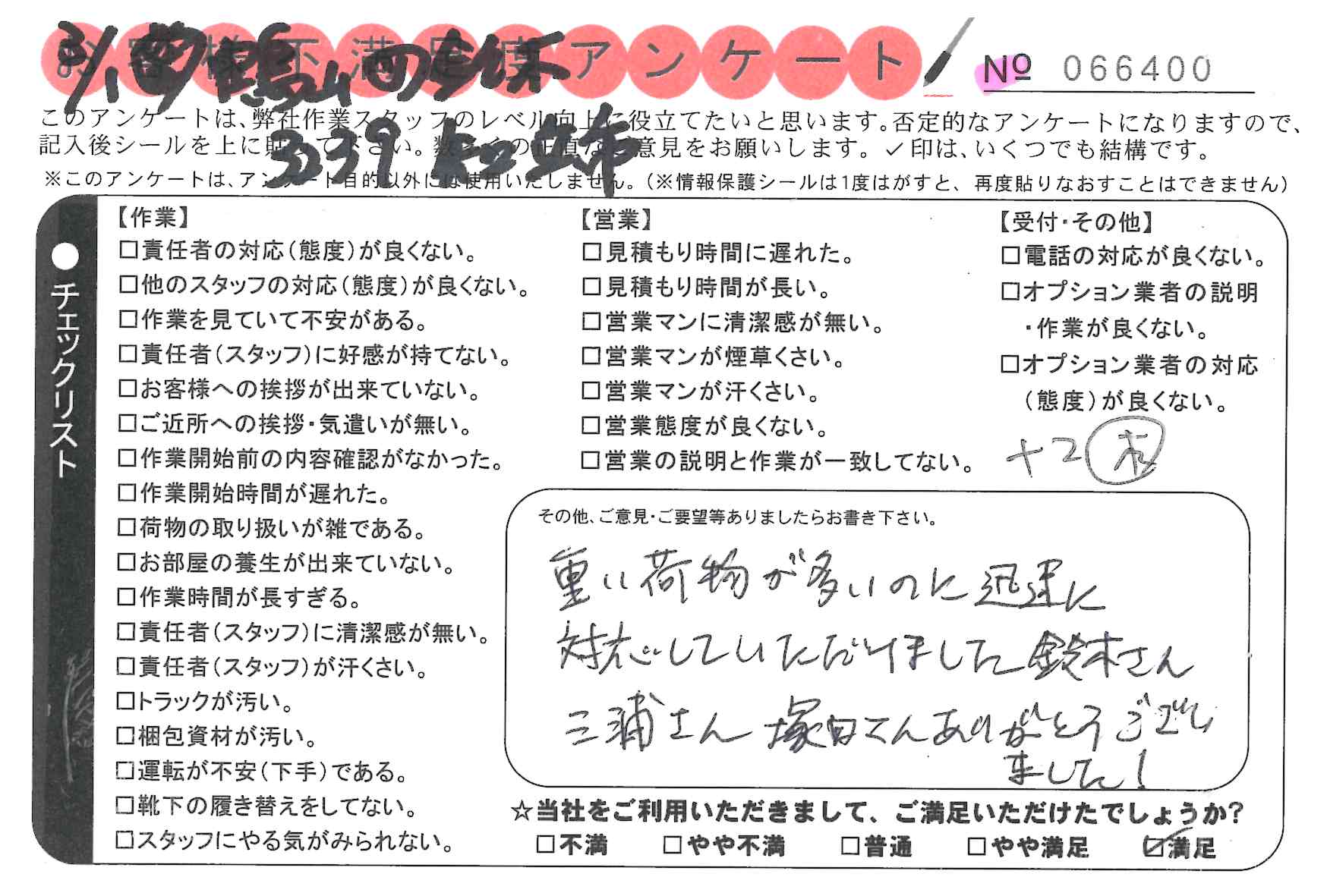 * 重い荷物が多いのに迅速に対応していただけました